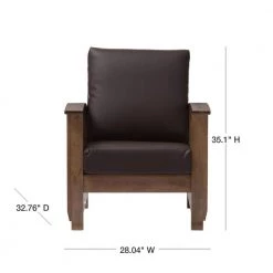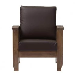 Welcome home to modern living with mission style. A mixture of classic designs and luxurious faux leather will make the Charlotte 1-seater lounge chair the most comfortable chair in the house. Featuring strong and durable construction with eco-friendly solid rubberwood, poplar and plywood board seat, the Charlotte will be stylish and timeless furniture for your living room. Inspired by mission style, the chair features strong and durable ready-to-assemble construction with slatted armrest and backrest. Heavily padded with foam and upholstered in dark brown faux leather, the lounge chair, with removable cushions will be a standout piece in any interior decor. A fully upholstered lounge chair with exposed dark walnut wood looks great from all angles, whether in a lounge arrangement, public waiting area or private office. This chair will be suitable for those urban dwellers with limited space. It could be a cool-looking reading nook within 30 minutes of assembly out of a box. Made in Malaysia.