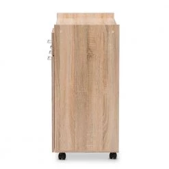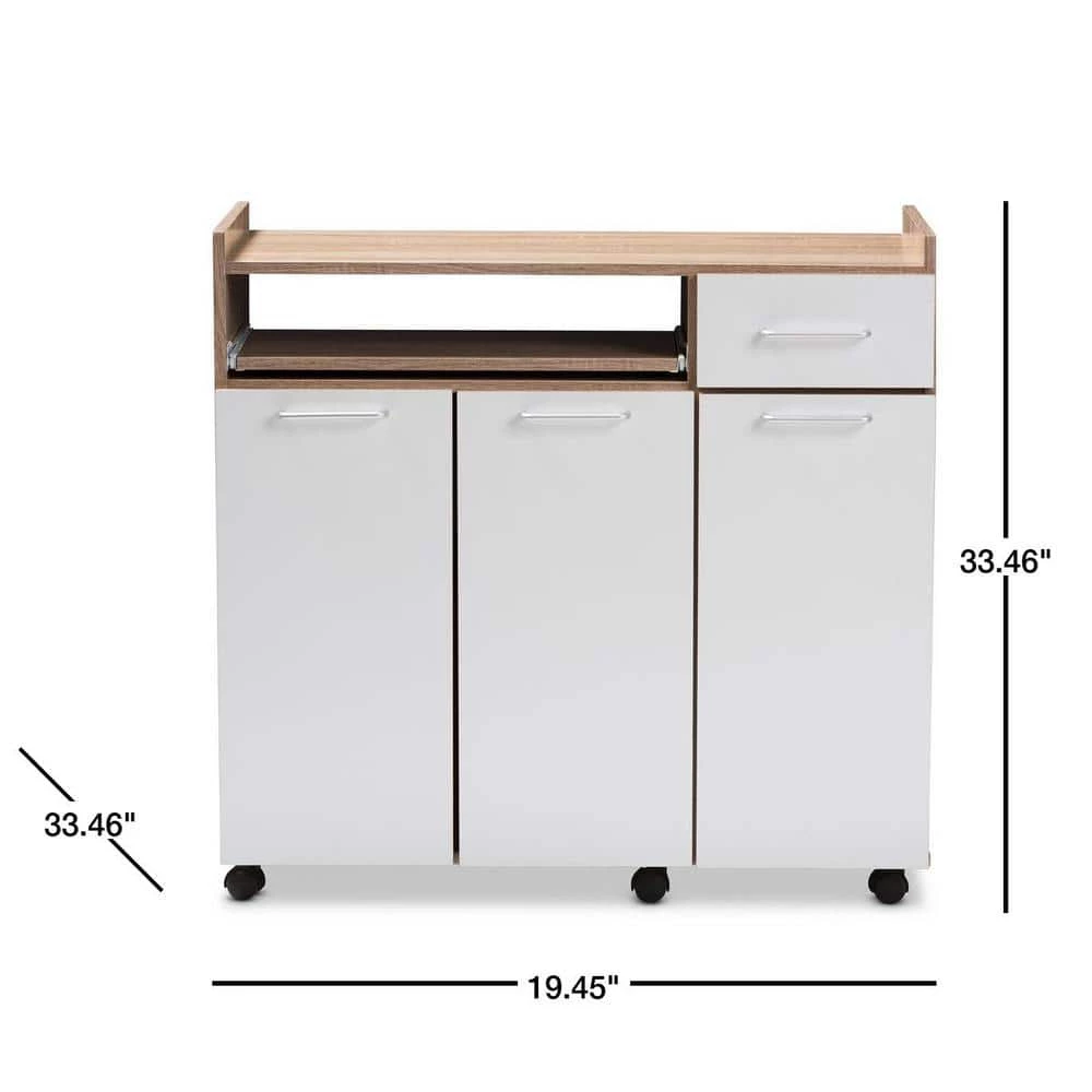 Add a calming, breezy look to your kitchen with the Charmain kitchen cabinet. The modern and contemporary-inspired design features clean, straight lines. The Charmain is finished in a light oak for a natural look, with a complementing white finish on the cabinet’s door faces. The cabinet features four shelf spaces behind discreet doors, and a drawer on the right hand side for additional storage for any utensils that are causing clutter. The Charmain also features a convenient slide-out tray underneath the main top workspace, making meal prep a breeze. The ample workspace on the cabinet top could easily hold a microwave, or prepared dishes to be wheeled out to guests. The Charmain comes with castors for mobility, so this cabinet can provide dishware storage or act as a serving cart to wheel to your dining room. Made in Malaysia, the kitchen cabinet requires assembly.