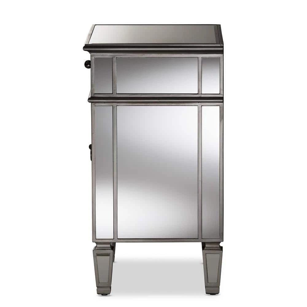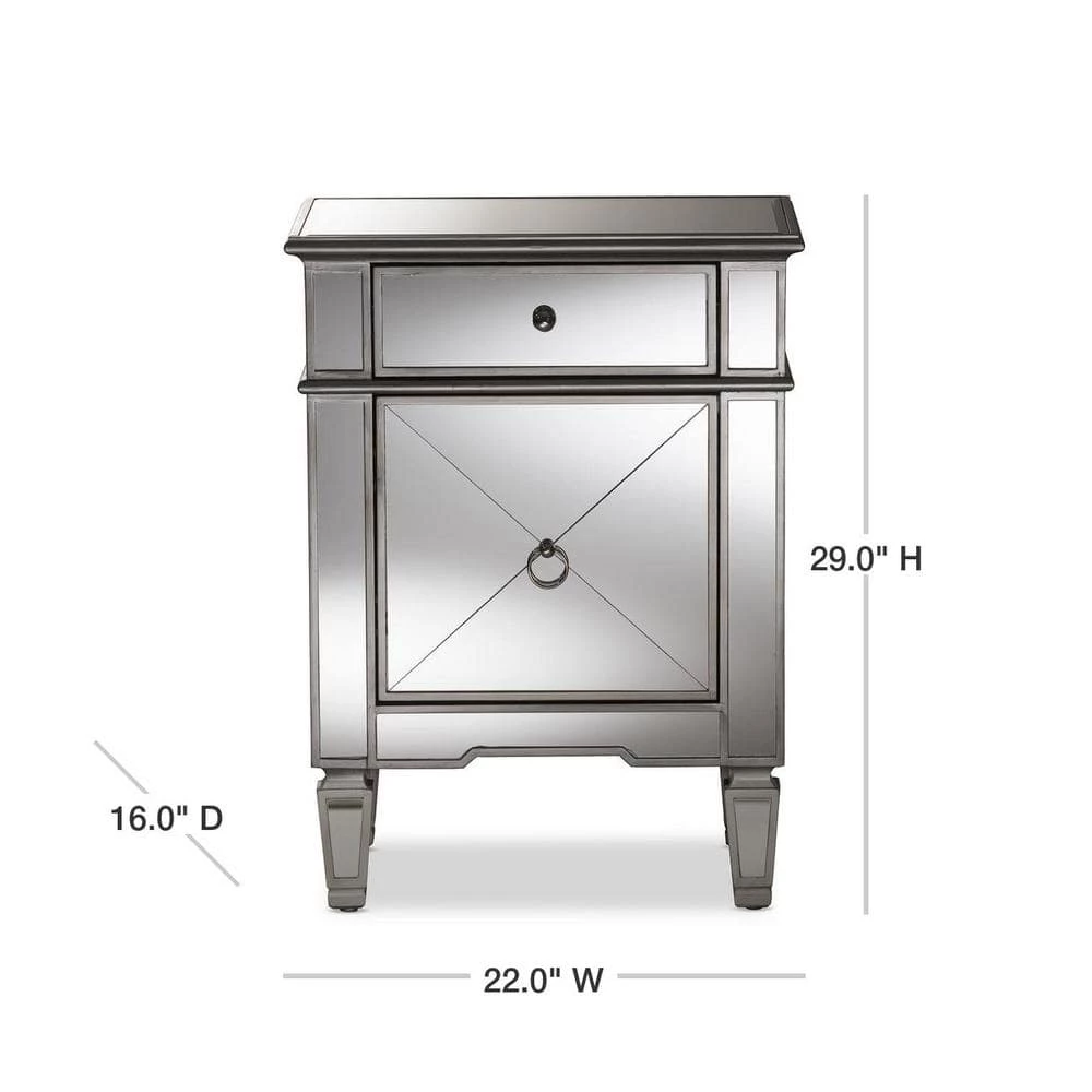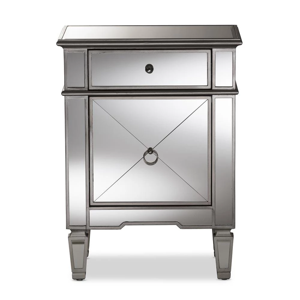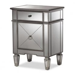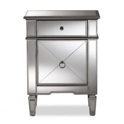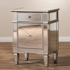 Featuring Hollywood glamour style, the Claudia mirrored nightstand has a silver lacquered edge and mirrored panels with crosshatch details. The Claudia will add light, sparkle and luxury to your bedroom as well as space for storing your personal items. Constructed of MDF and encased with mirror, the Claudia features one drawer and one door with nickel drawer pull and ring. The attached mirrored feet with silver edge elevates the height of the Claudia to go with your bed height. Made in China, the Claudia will arrive fully-assembled.