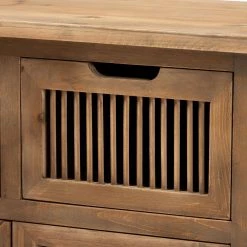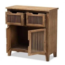 Rustic tones and clean lines make the Clement cabinet a handsome addition to any space. This sturdy wood cabinet displays a medium oak finish that highlights the wood grains for a cozy, rustic look. One storage compartment, behind a pair of doors, provides ample space to store books or display trinkets. Two drawers provide additional storage space. Spindle detailing lends visual interest, while cut-out door handles enhance the cabinets natural appeal. The Clement cabinet is made in China and will arrive fully assembled.