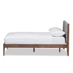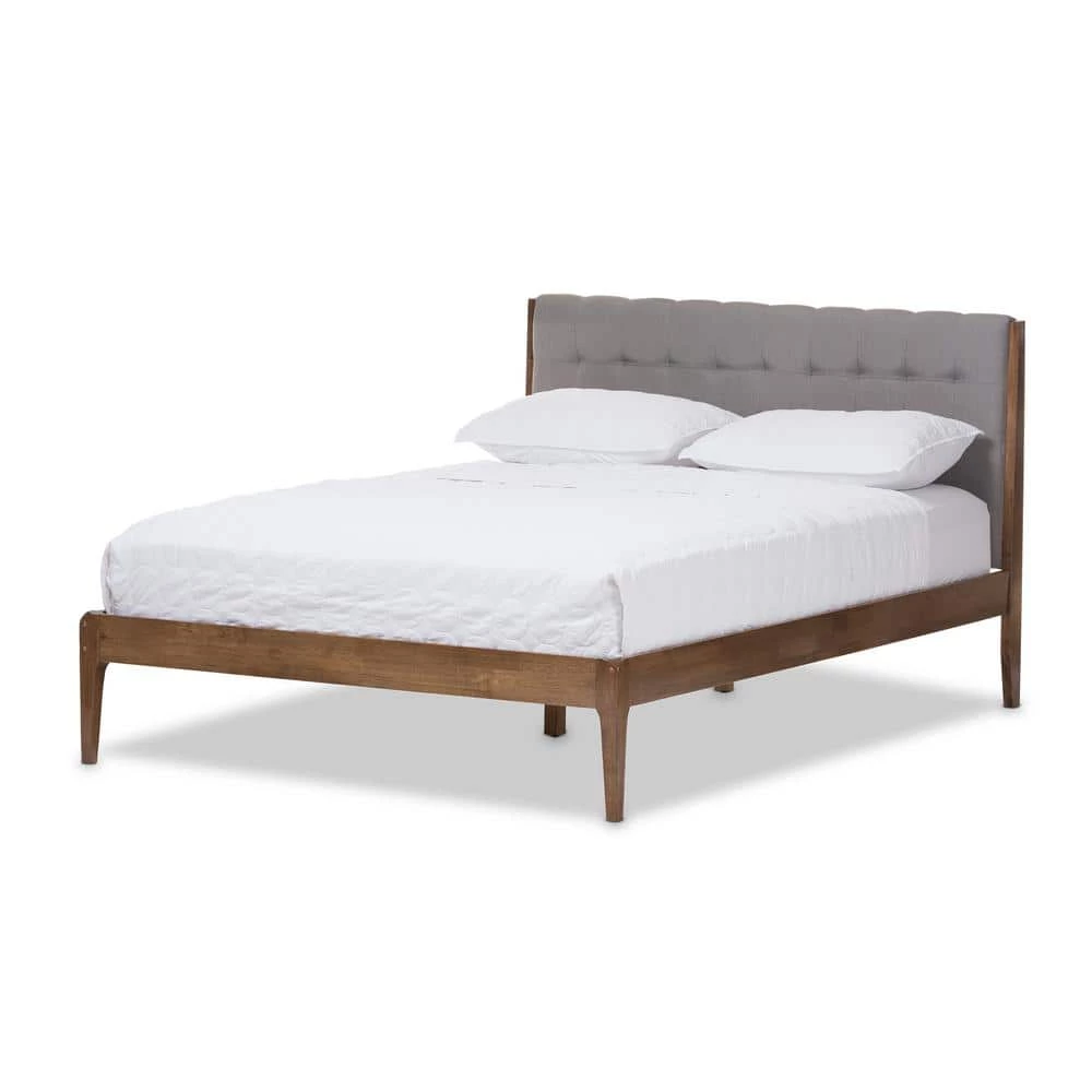 With a luxuriously fabric-covered headboard that adds an elegant touch to the solid wood frame, the Clifford bed will be a standout piece in any bedroom. With high-quality hardwoods and fabric headboards, this king-sized, platform bed blends perfectly with modern and contemporary bedroom suites. Infusing unique designs with superior craftsmanship, the Clifford ensures that you will receive the finest quality as each item is handmade and inspected. Constructed of eco-friendly solid rubberwood in dark walnut finishing, the Clifford is upholstered in textured light grey fabric with modern grid-tufting and cushioning while the solid wood frame has smooth lines punctuated by sharp cornered joinery. To ensure a comfortable night’s sleep, the traditional slats of the base have been closely spaced to provide firm support that suits standard size mattresses. Made in Malaysia, the king-size bed requires assembly.
