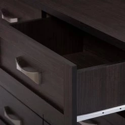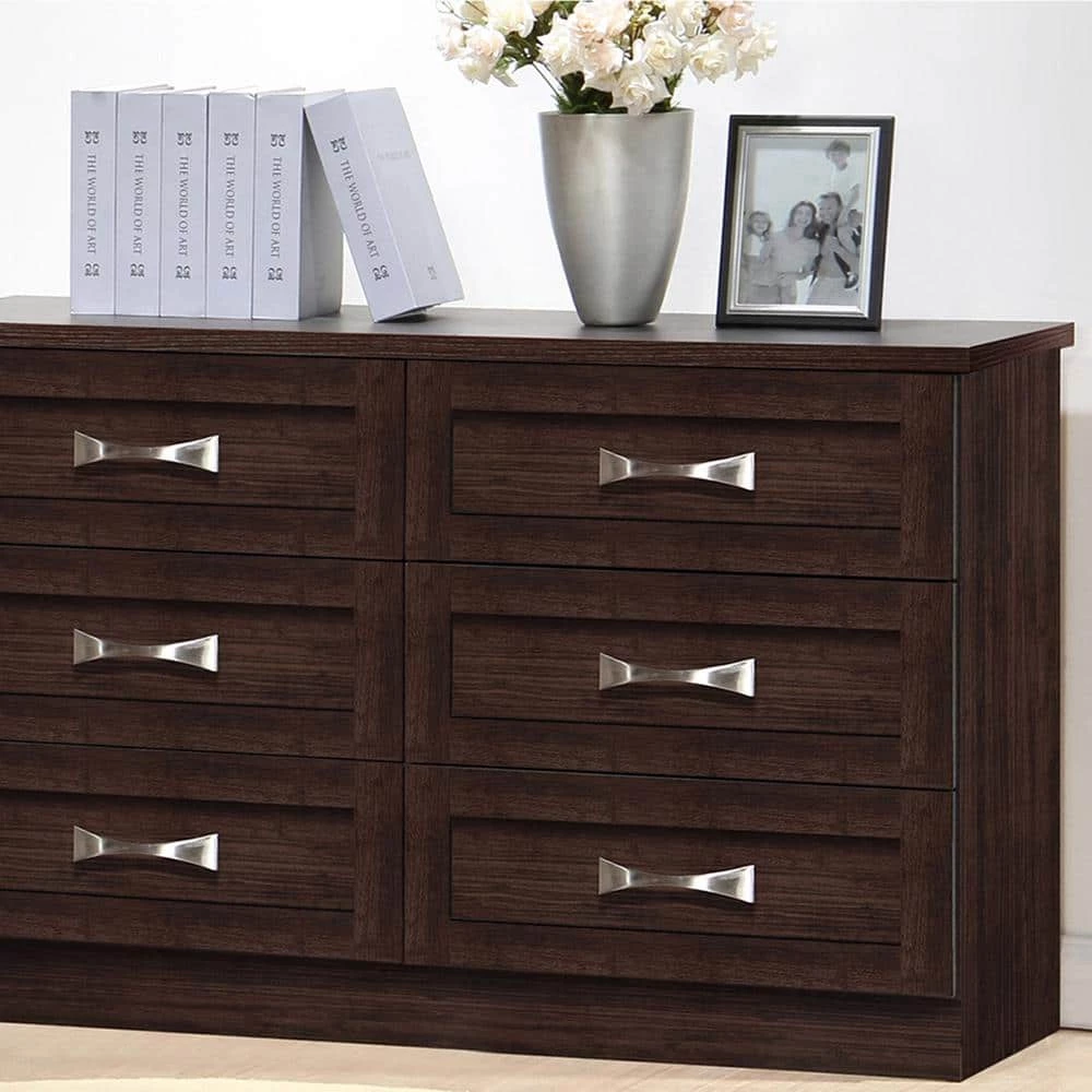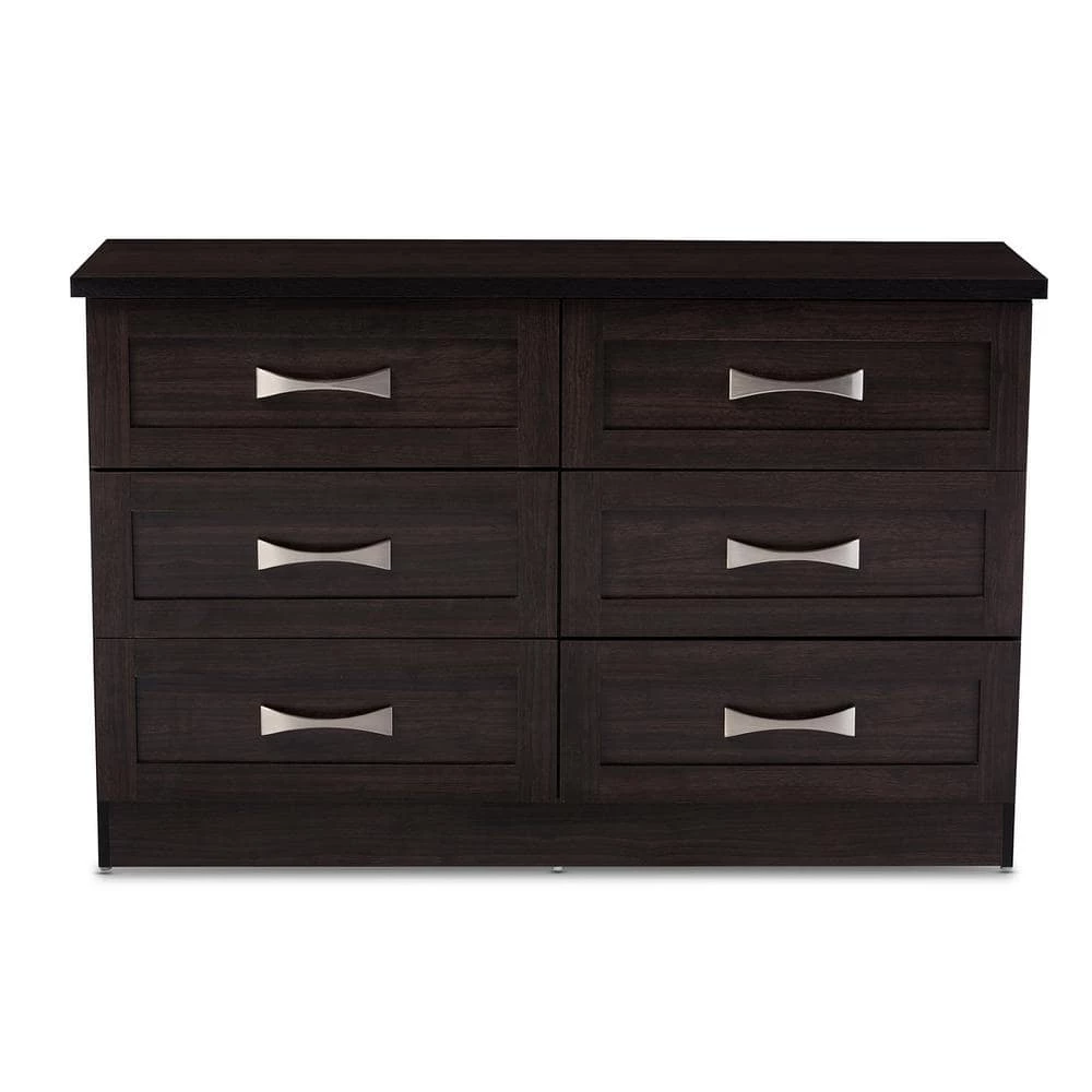 Organize your interior with the Colburn 6-drawer Dark Brown Finish Wood Storage Resort. Its streamlined drawers and table-top offering modern style with minimal fuss. Made from high-density engineered wood boards for long-lasting strength and a sturdy form, with quality runners for smooth functionality. Covered with an espresso brown PU veneer finish for a smooth, stylish and easy-to-maintain surface. Design features six large drawers, each with a metal handle, providing your bedroom with generous clothes or bedding storage space. Simple design lines and dark-wood palate combine to create a traditional piece that works well in a range of different interior styles. Made in Malaysia, the storage dresser requires assembly.