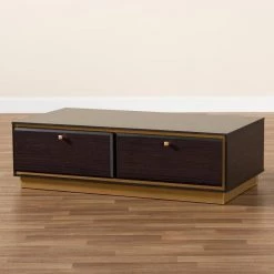 Injected with modern glamour, the Cormac coffee table is sure to become a bold anchor point in any layout. Made in Malaysia, this handy piece is comprised of a sturdy wood frame adorned with metal accents. Two drawers offer convenient storage space, while the open shelf serves as a handy display for books, movies, and decorations. The Cormac requires assembly and features tapered drawer knobs, which accentuate the luxurious embellishments of the piece. Updated for the modern era, the Cormac coffee table grants a pleasant aura to any space.