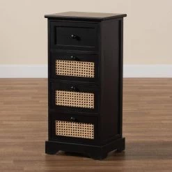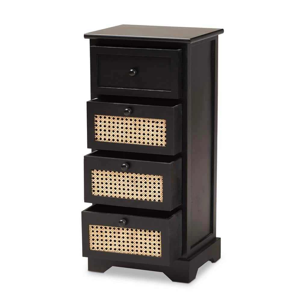 A beautiful piece of modern design with a retro feel, the Dacey storage cabinet elevates any interior layout. Made in China, this handy piece is comprised of a sturdy wood frame accented with rattan. Four drawers offer storage to organize your home while woven rattan drawer faces produce an atmosphere of warmth. Requiring minor assembly, the Dacey features round drawer knobs and inset paneling for a striking texture and depth. With excellent convenience in a remarkable design, the Dacey storage chest enhances any space. This is a product of nature and may have variations in areas such as, but not limited to, color, pattern, grain and texture. The hair-like strands of rattan/rattan-fiber are common due to nature of the material.