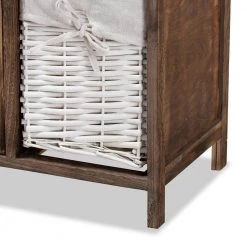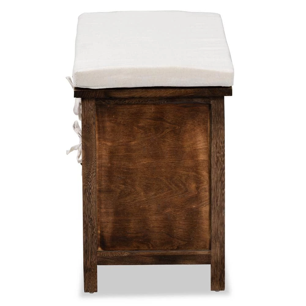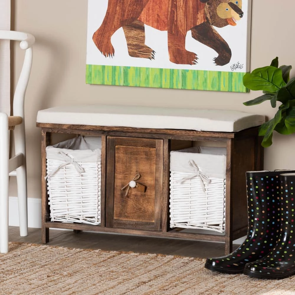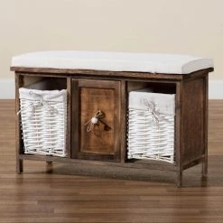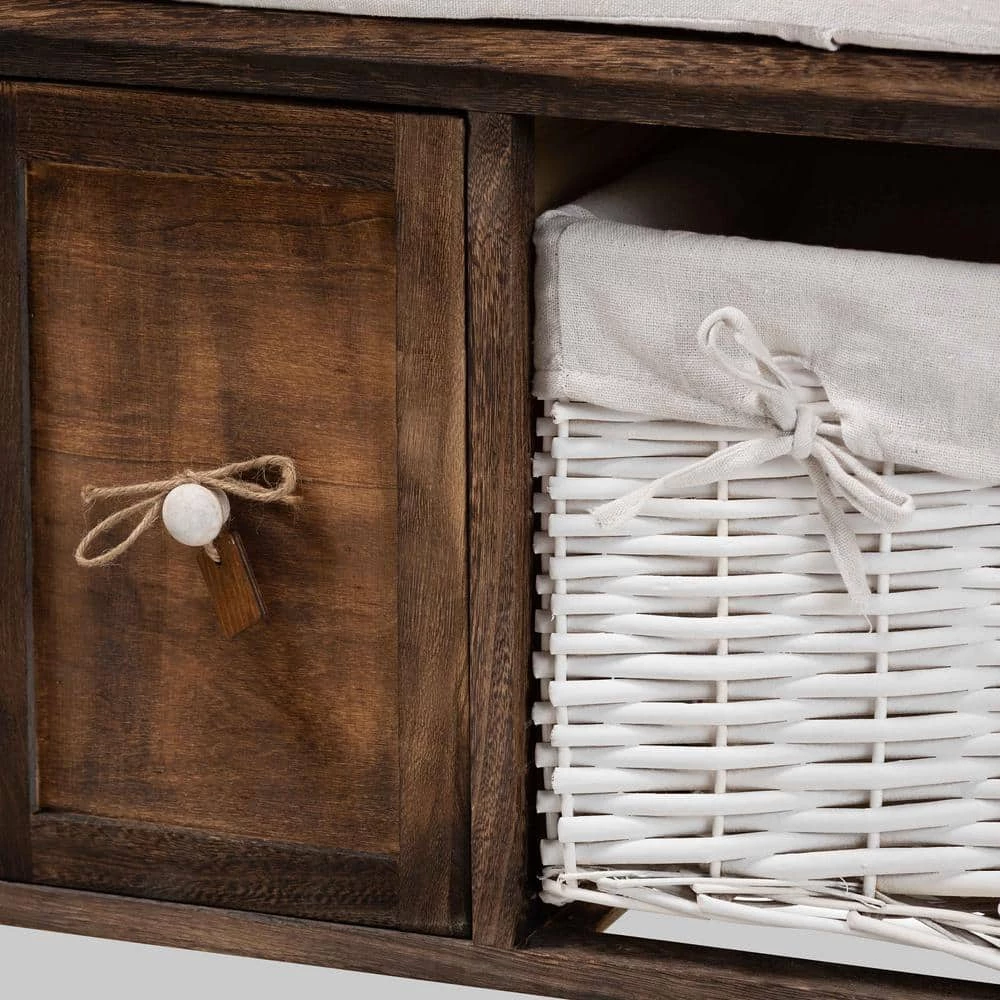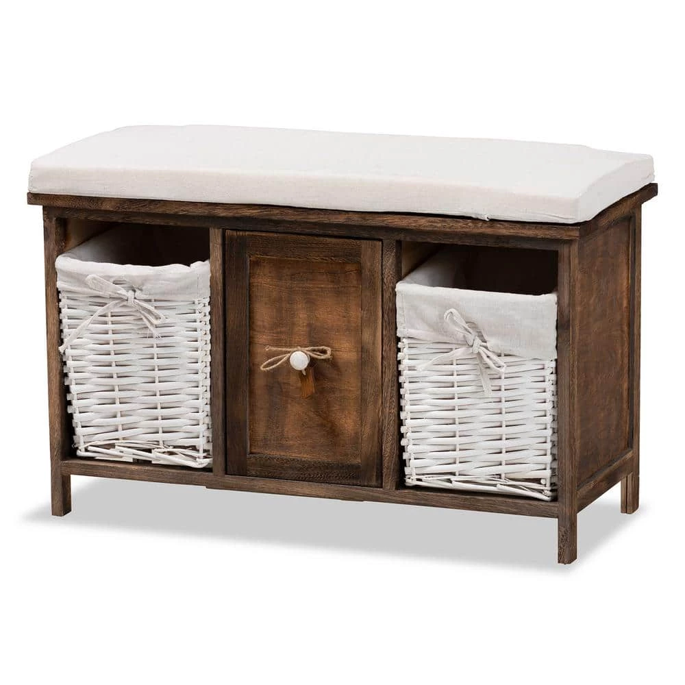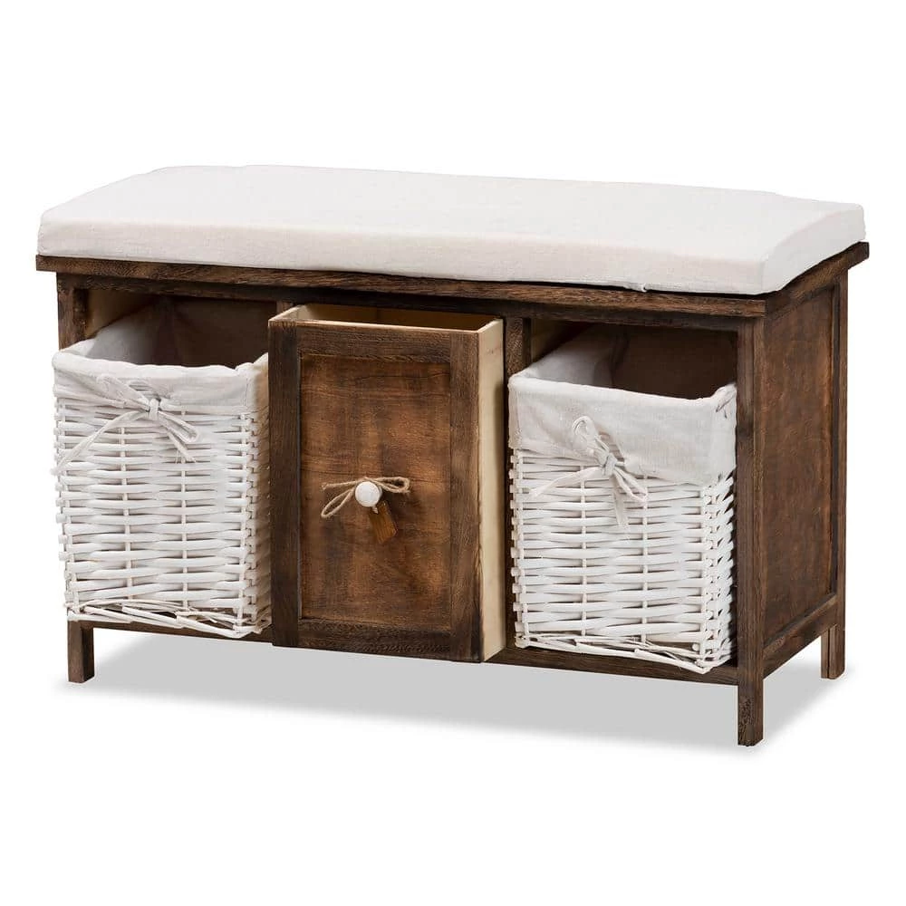Unique and versatile, the Dalius storage bench furnishes your entryway with modern convenience. Made in China, this bench is comprised of a sturdy wood frame fitted with willow baskets. Two baskets and one drawer provide ample space to organize shoes and other outdoor essentials. Comes fully assembled, the Dalius features a plush cushion padded with layers of foam and upholstered in fabric for smooth comfort. Inset paneling lends visual texture and depth, making the Dalius storage bench a striking addition to the modern entryway.