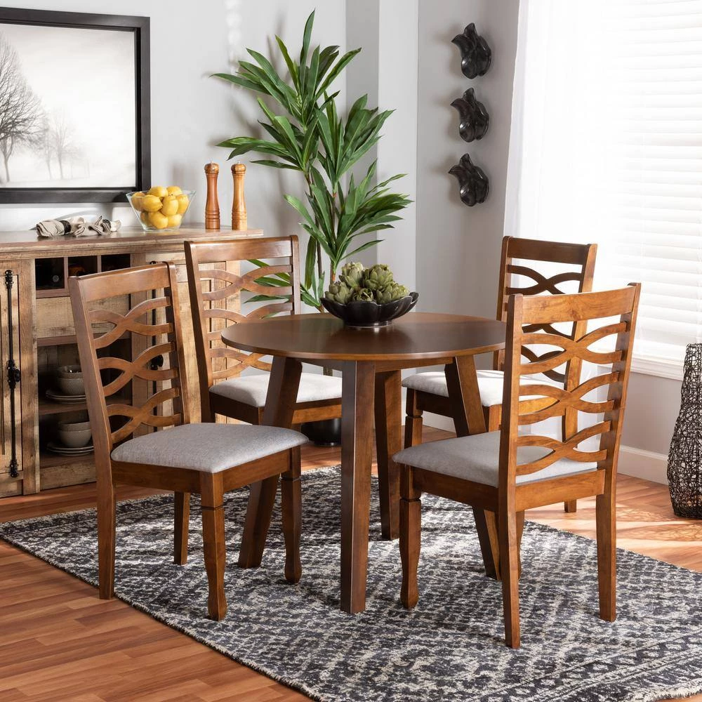 Sophisticated design joins modern comfort with the stunning Darina dining set. Made in Malaysia, this wooden set includes one table and four dining chairs, each upholstered in a light fabric that complements the warm walnut wood finish. Plush foam padded seat cushions provide superb comfort, while a cut-out design on each backrest lends an elegant aesthetic. Requiring assembly, the circular tabletop provides ample elbow room for each member of the table. Equally enjoyable for both dinner parties and family dinners, the Darina dining set is a timeless addition to any space.