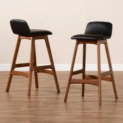 Add ergonomic and minimalist appeal to your dining space with the Darrin bar stool. Made in Malaysia, the Darrin showcases a warm walnut brown finish that easily coordinates with a variety of color schemes and styles. The seat and backrest are padded with foam and upholstered in sleek black faux leather. Requiring assembly, the Darrin is equipped with a footrest for added comfort. Ideal for a home bar or lounge area, the Darrin counter stool adds contemporary comfort to any space.