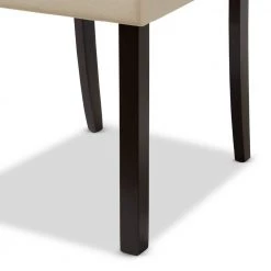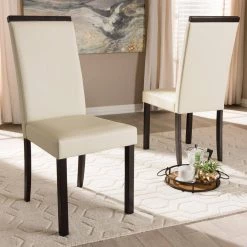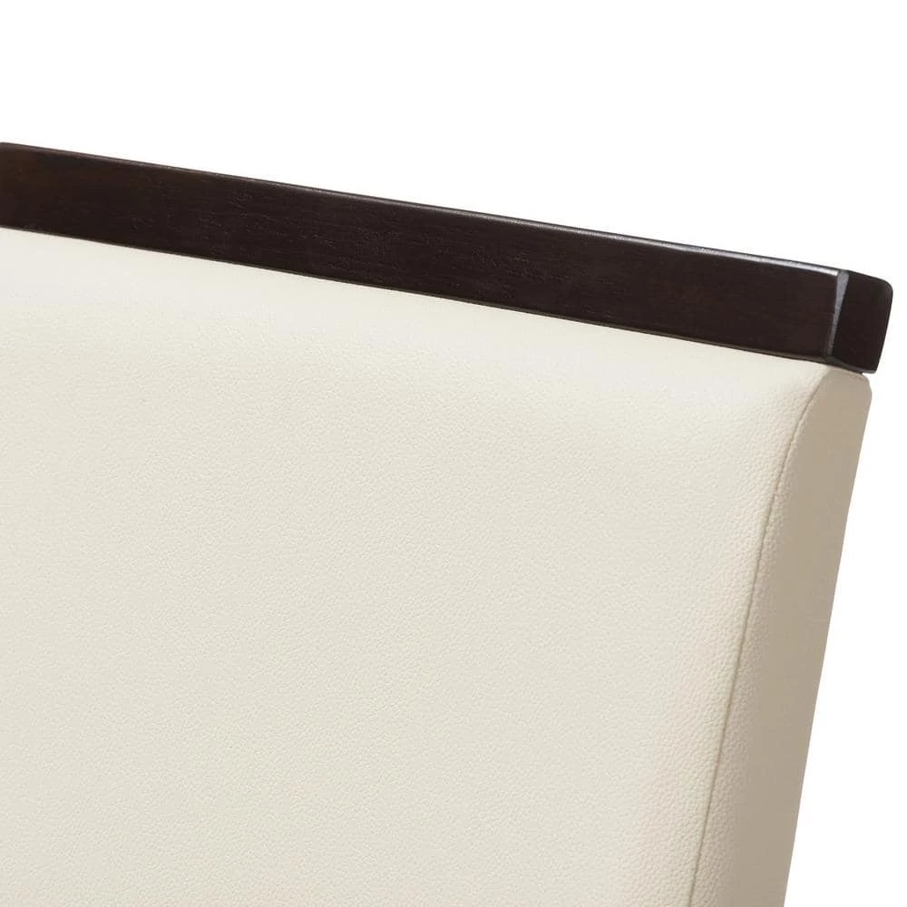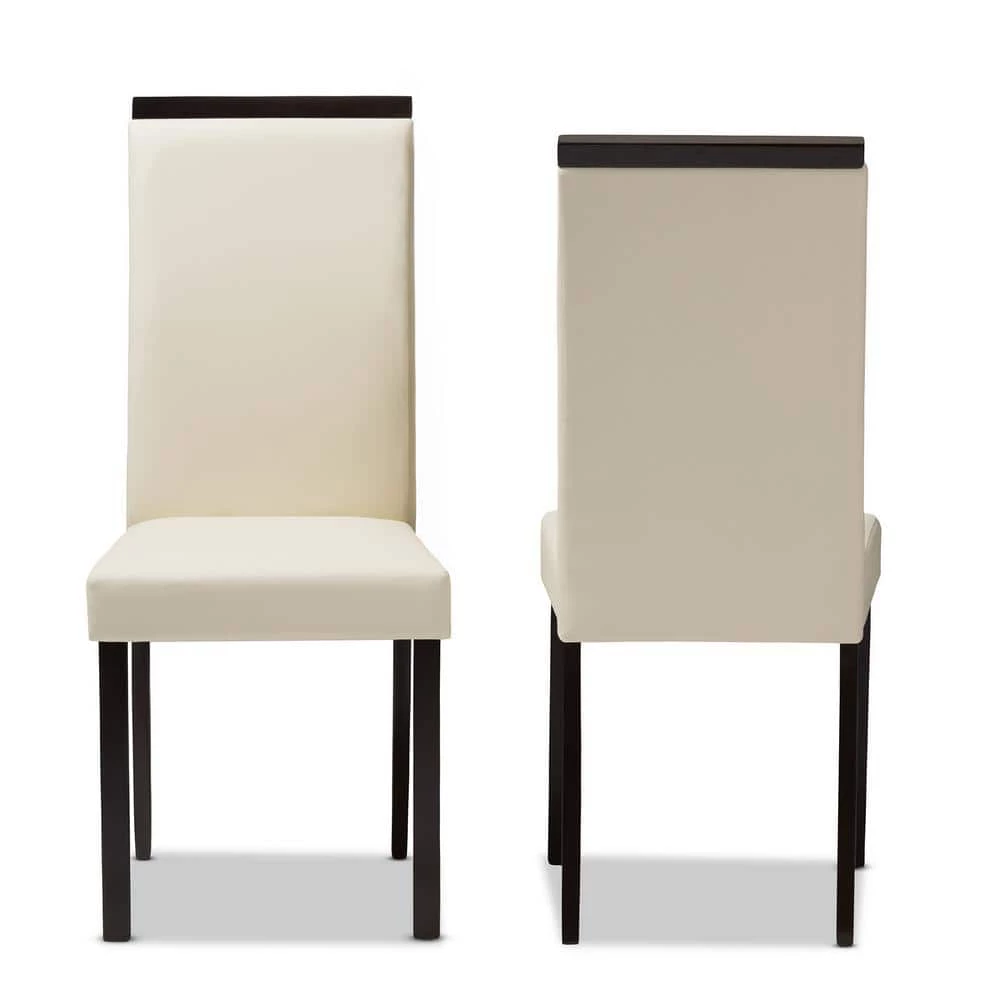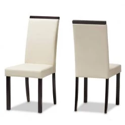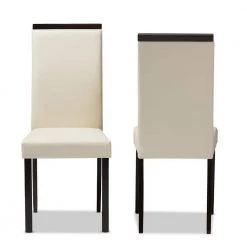 Add a refreshing, sleek style to your dining area with the Daveney dining chair. The chair’s clean, minimalist design evoke a clearly modern and contemporary-inspired feel. The Daveney is upholstered in cream-colored faux leather, with dark brown finished wood legs. The chair features foam padding and a gently arched chairback for comfort. The low profile design of the Daveney can add a touch of sophistication to your dining room and other shared spaces – it’s easy to coordinate the warm colors of this chair with your existing decor. Made in Malaysia, the Daveney requires assembly.