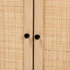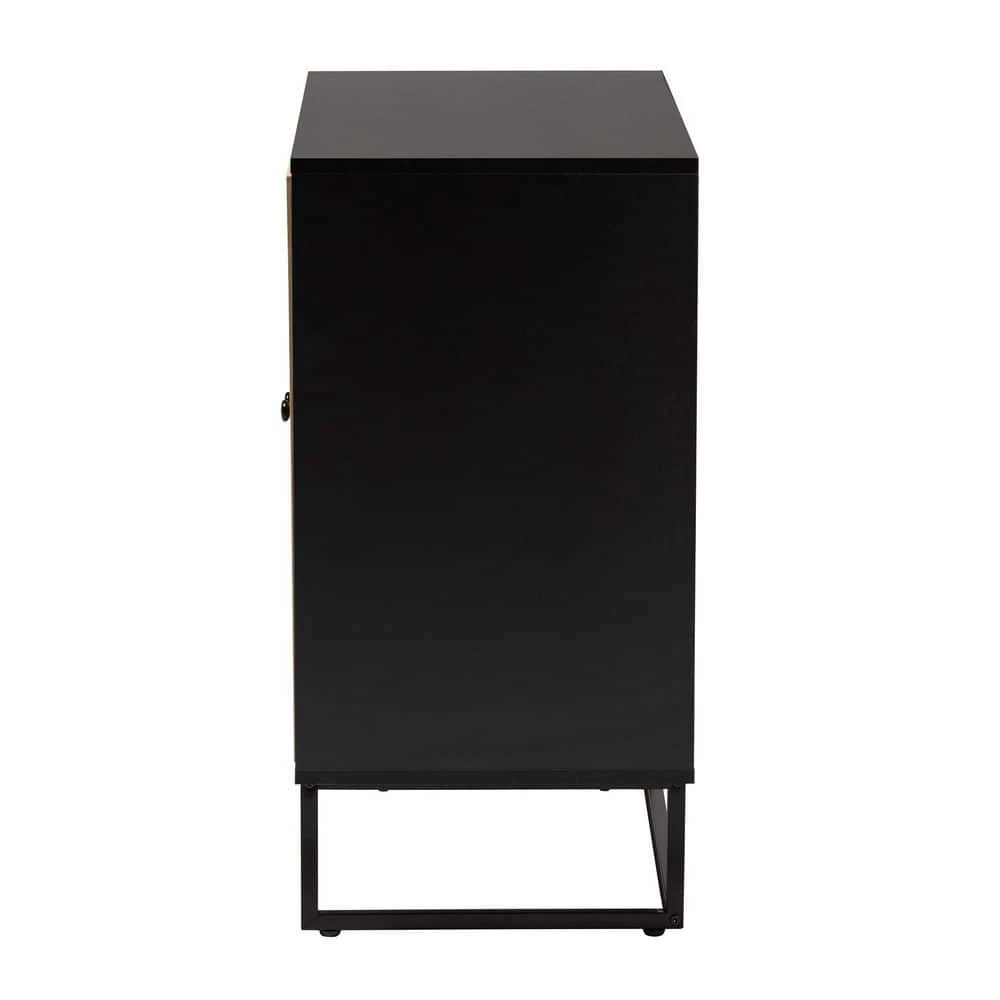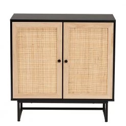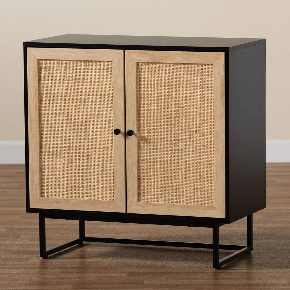 Give your interior a breath of modern flair with the Declan storage cabinet. Made in China, this lovely piece consists of wood frame resting atop a solid metal base. The doors open to reveal two spacious shelves that assist in organizing busy areas while round door knobs lend a smooth geometric display. The Declan requires assembly and features woven rattan embellishments for a touch of classic artistry. Conveying traditional style with fantastic utility, the Declan storage cabinet is an exquisite addition to any arrangement.Due to the nature of the natural materials used in this product, it may have variations in areas such as, but not limited to, color, pattern, grain and texture. The hair-like strands of rattan/rattan-fiber are common due to nature of the material.