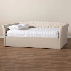 A comfortable place to lounge or sleep, the Delora daybed brings versatility to any space. This wood daybed is upholstered in a soft, resilient polyester fabric and is padded with foam for the utmost comfort. Flared arms and elaborate button tufting lend a classic, refined look. Add some throw pillows to create a cozy hangout during the day, then, at night, switch out the pillows for a plush duvet to sleep the night away. The Delora daybed is made in Malaysia and requires assembly.