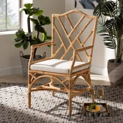 Elegant comfort meets tropical design with the splendid Delta dining chair. Handmade in Indonesia, this chair is comprised of natural rattan. The plush cushion is padded with soft foam and upholstered in smooth fabric for excellent comfort. Fully assembled, the Delta features a sleek, angular design on its backrest that adds geometric appeal to any space. A stunning design that expertly balances style and comfort, the Delta dining chair enhances any space.This is a product of nature and may have variations in areas such as, but not limited to, color, pattern, grain and texture. The hair-like strands of rattan/rattan-fiber are common due to nature of the material.
