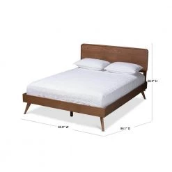 Refresh your bedroom with the retro style of the Demeter bed. Built with a low platform set on top of angled, tapered legs, the Demeter displays all the hallmarks of stylish mid-century modern design. The headboard features curved edges and inset detailing, showcasing its fine craftsmanship. Constructed from sturdy wood, the Demeter flaunts a rich walnut brown finish that brings a sense of warmth to any color palette. The Demeter bed is made in Malaysia and requires assembly.