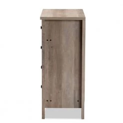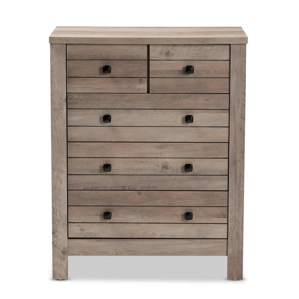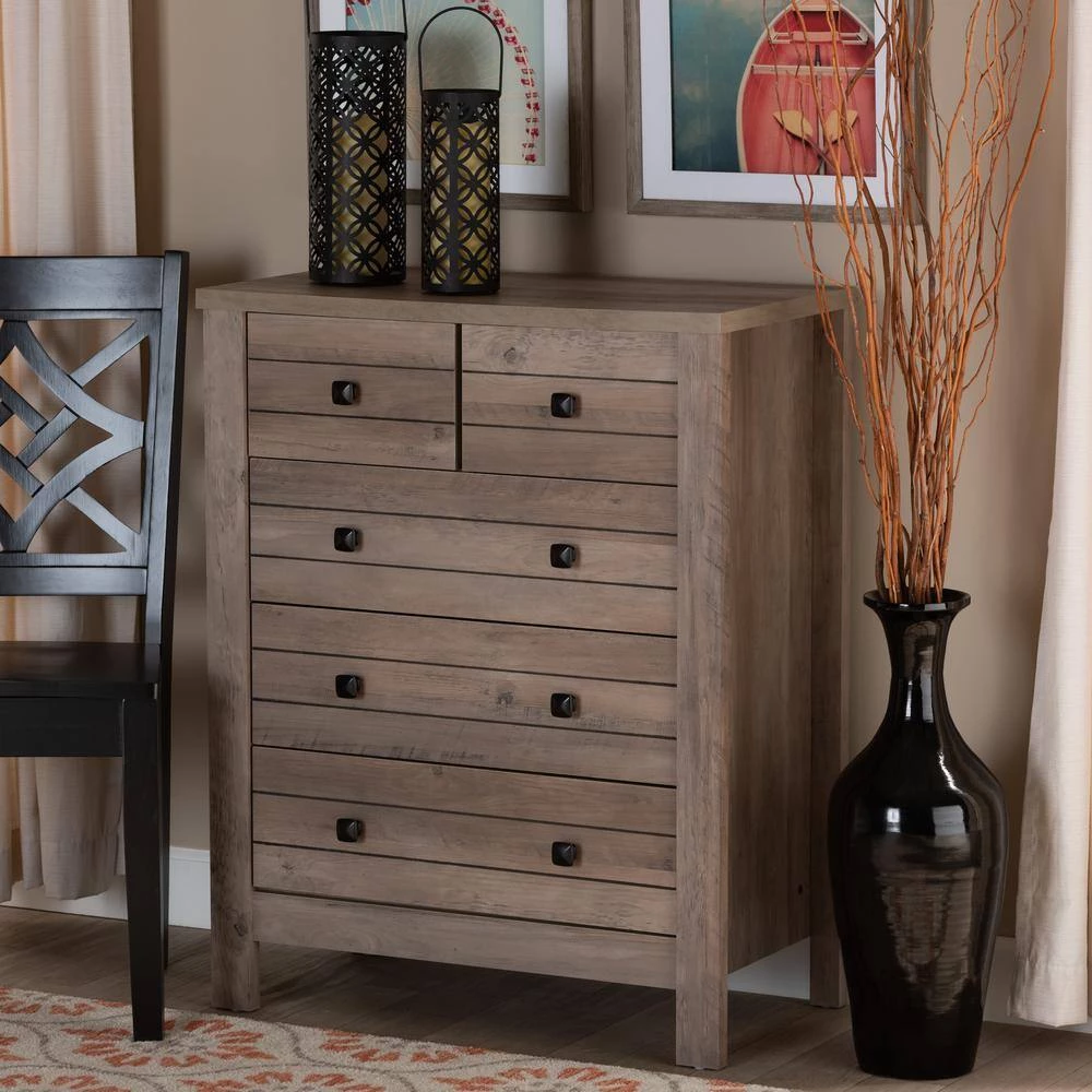 Add valuable storage to any space with the convenient Derek chest. Made in Malaysia, the Derek is constructed from sturdy wood showcasing a natural oak finish that easily coordinates with a large variety of existing color palettes. Three large drawers and two medium sized drawers provide ample storage for clothes, linens, and other various items. Requiring assembly, the Derek is ornamented with black finished square metal drawer handles that stand out brilliantly against the natural wood finish. Organize any bedroom in style with the Derek chest.
