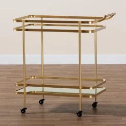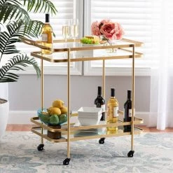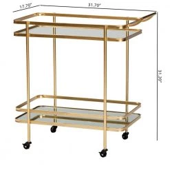 An exquisite design makes the Destin wine cart a perfect attendant to serve or display your wine collection. Made in China, the Destin is comprised of a stunning brushed gold finished metal frame fitted with 2-tier of clear glass and mirrored glass shelves. The borders of each shelf are protected with guard rails to secure items. Fully assembled, the Destin rests on four caster wheels for versatile movement. A handy and visually striking serving station, the Destin wine cart is an excellent accessory for any enthusiast.