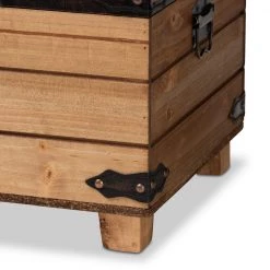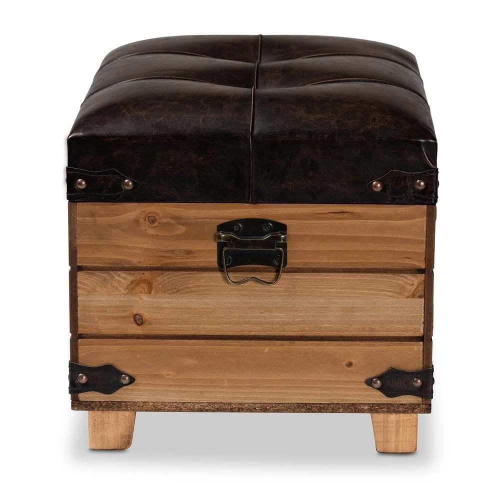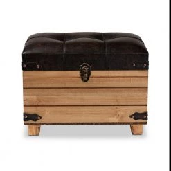 The Edmund storage ottoman solves your storage needs with a rustic yet handy design. Made in China, this ottoman is comprised of a sturdy wood frame featuring an oak brown finish that lends a rustic feel. Its button tufted cushion is padded with plush foam and upholstered in smooth faux leather, creating a cozy footstool or extra seat when needed. Fully assembled, the top of the Edmund opens to reveal ample storage space for extra blankets, pillows, and more. Antique brass finished metal handles and a latch add a vintage touch, making the Edmund ottoman a fantastic addition to any space.