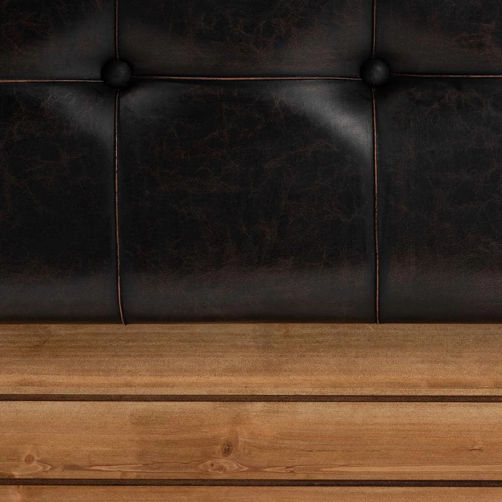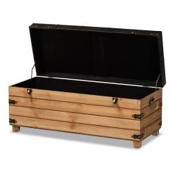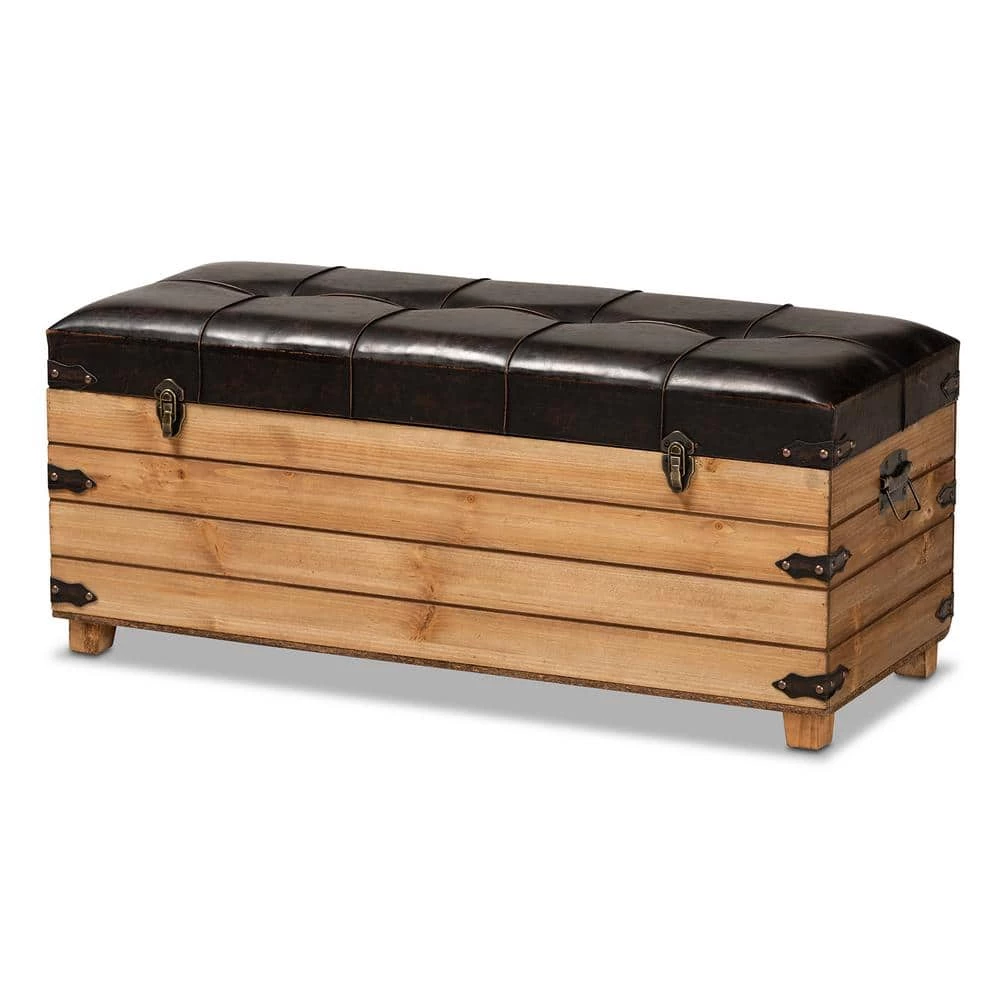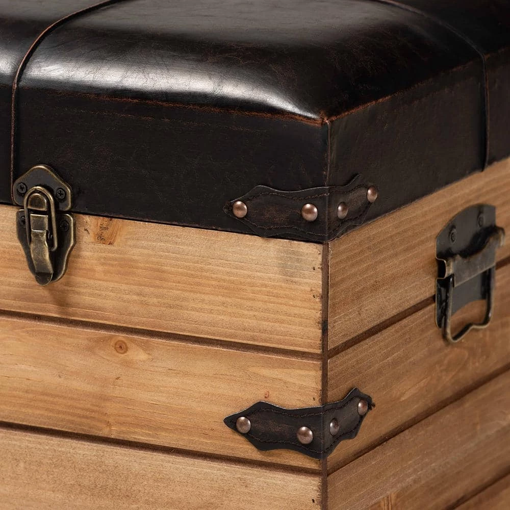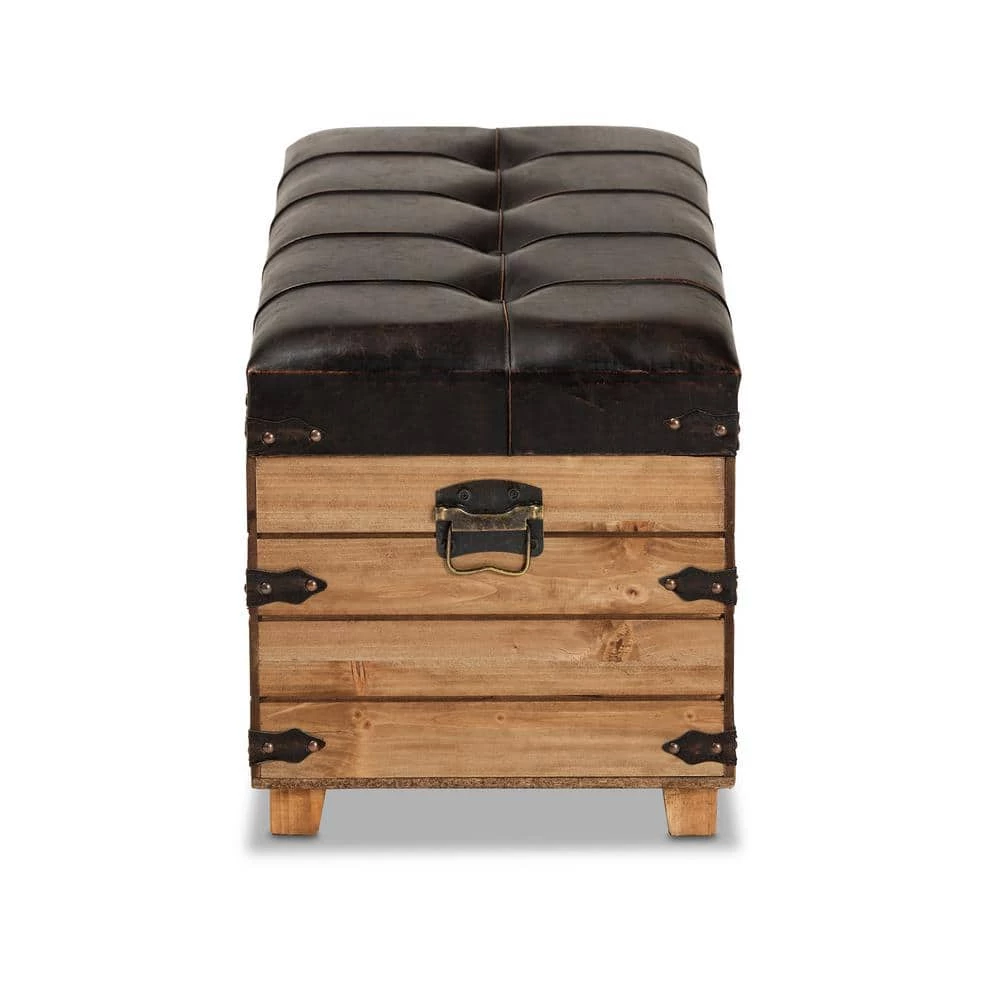 The Edmund storage ottoman solves your storage needs with a rustic yet handy design. Made in China, this ottoman is constructed from sturdy wood. Its button tufted cushion is padded with plush foam and upholstered in smooth faux leather, creating a cozy footstool or extra seat when needed. Fully assembled, the top of the Edmund opens to reveal ample storage space for extra blankets, pillows, and more. Antique brass finished metal handles and a latch add a vintage touch, making the Edmund ottoman a fantastic addition to any space.