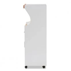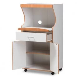 Add both practicality and style to your kitchen or dining room with the Edonia kitchen cabinet. The modern and contemporary-inspired design is clear to see in the rectangular silhouette and subtle grooved features. The Edonia is finished in white with beech brown wood finishing on the edges for a two-tone look. The cabinet features two shelf spaces behind discreet doors, and a drawer on top of them for additional storage. The Edonia’s top compartment has ample space for a microwave, with a cut-out in the back panel for wire management. Even more convenient, the space for the microwave is on a pull-out tray, moving smoothly on drawer sliders. The Edonia comes with castors for mobility, so this cabinet can provide storage for utensils and dishware, and can be moved easily for cleaning. Made in Malaysia, the kitchen cabinet requires assembly.