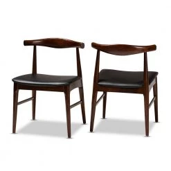 Clean lines and luxe faux leather make the Eira dining chair a sleek addition to any dining space. Constructed from solid rubberwood, the Eira showcases a stunning dark walnut brown finish. The seat is upholstered in black faux leather and padded with foam for dining comfort. Additional comfort is provided by the curved backrest. Inspired by mid-century modern design, the Eira features a low silhouette and angled, tapered legs. The Eira dining chair is made in Malaysia and requires assembly.