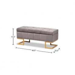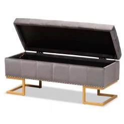 Luxurious seating doubles as practical storage in the versatile Ellery ottoman. Made in China, the Ellery is comprised of a sturdy wood frame padded with soft foam and upholstered in smooth velvet fabric. Its lift up top reveals ample storage space for extra blankets and linens. Requiring assembly, the ottoman is set on a stunning gold finished metal base that lends a glamourous aesthetic. Button tufting and silver finished metal nailheads add modern style, making the Ellery ottoman an eye catching addition to any space.