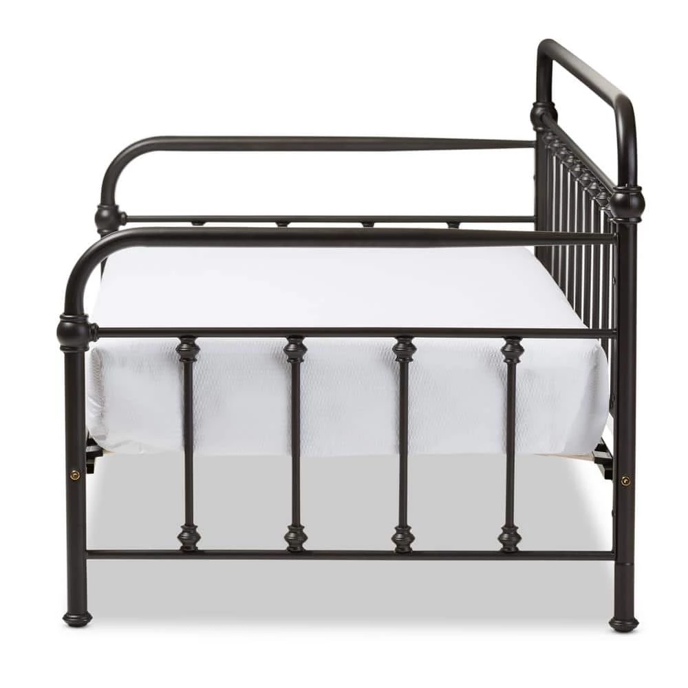 Inspired by classical Victorian style, the Elsie is a retro modern piece of daybed. With its soft gentle curved headboard and footboard, the Elsie daybed will make a stunning addition to your living room or bedroom. Constructed of metal tube in stippled black finishing, this metal daybed features graceful lines with detailed castings and spindled rails. The Elsie can be utilized as a sofa on which to relax and laze during the day and evening, and speedily transformed into a swanky single bed at night. Complete with sprung slats for optimum comfort and lumbar support, the daybed would be a welcome and versatile addition to a bedroom, apartment or other living space. The daybed also has the benefit of a generous space underneath, which could be used for extra storage or for bed linen if the daybed is being regularly utilized as dual purpose. The Elsie daybed represents excellent value for money with its 2-in-1 functions. Made in Malaysia, the Elsie daybed requires assembly.