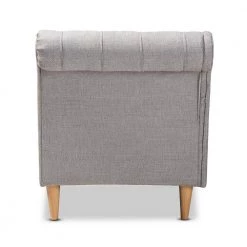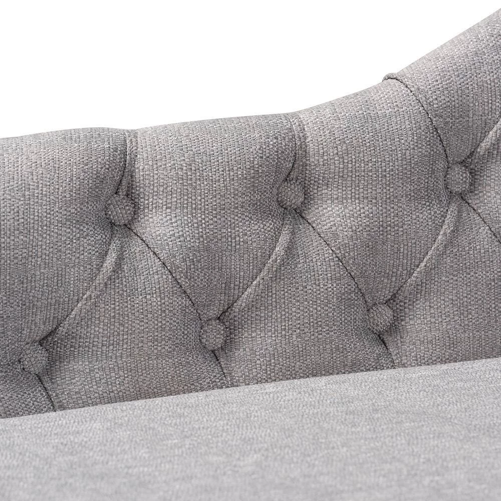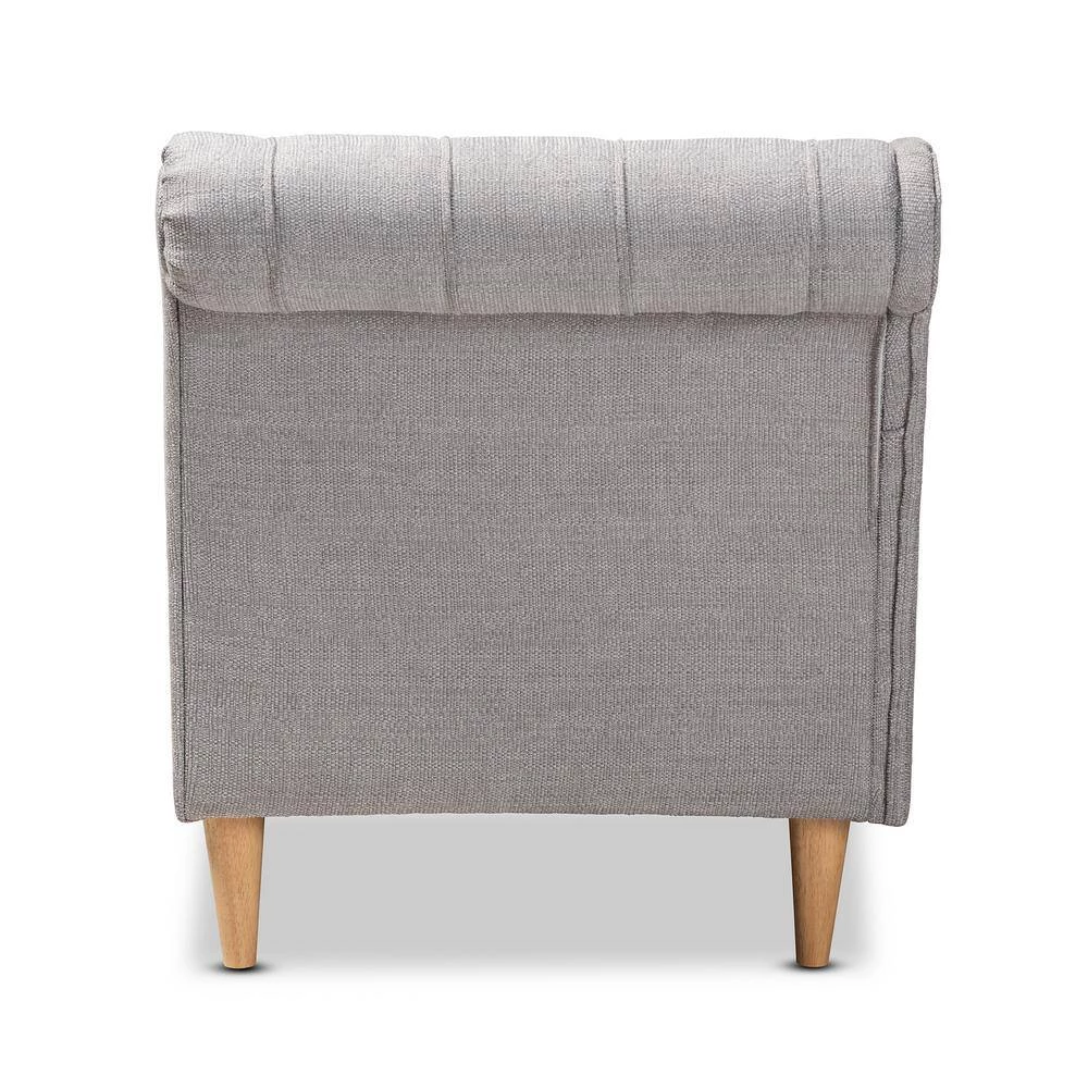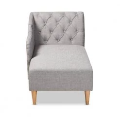 Lounge in style and comfort with the Emeline chaise. This Victorian-inspired chaise features a graceful scroll back and single arm that display lavish button tufting. Designed to add both elegance and function to your space, the Emeline is crafted from sturdy wood and upholstered in a soft, foam filled fabric for the utmost relaxation. The chaise is set on top of tapered, oak finished legs, adding a modern twist to this classic chaise. The Emeline chaise is made in Malaysia and requires assembly.