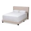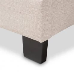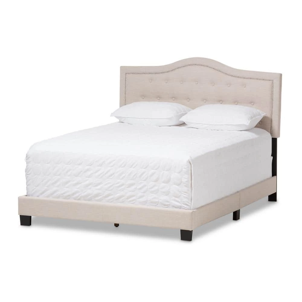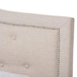The Emerson fabric upholstered bed is relaxed and quietly elegant. Soft beige polyester fabric upholstery is complemented by black painted wood legs for a graceful piece of bedroom furniture. Featuring curvaceous headboard, the bed is button-tufted for a classic look while silver nail heads trimming reflects its glamour. Matching with a low footboard, the Emerson will create an airy feel in a small room setting. For you to lean back comfortably, the bed frame is padded throughout with foam over its solid rubber wood frame. Standard US box spring and mattress will complement this king-sized Emerson bed for an elevated bed height. Made in Malaysia, the Emerson requires assembly.