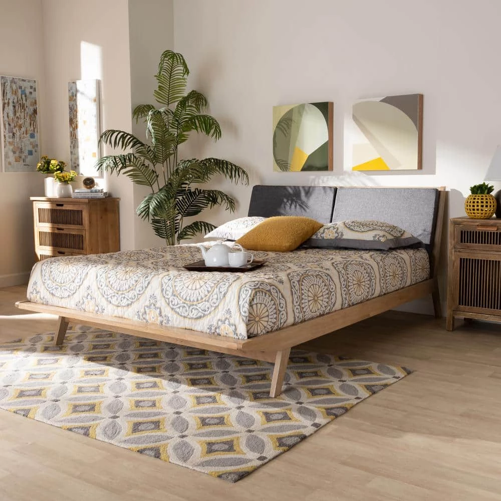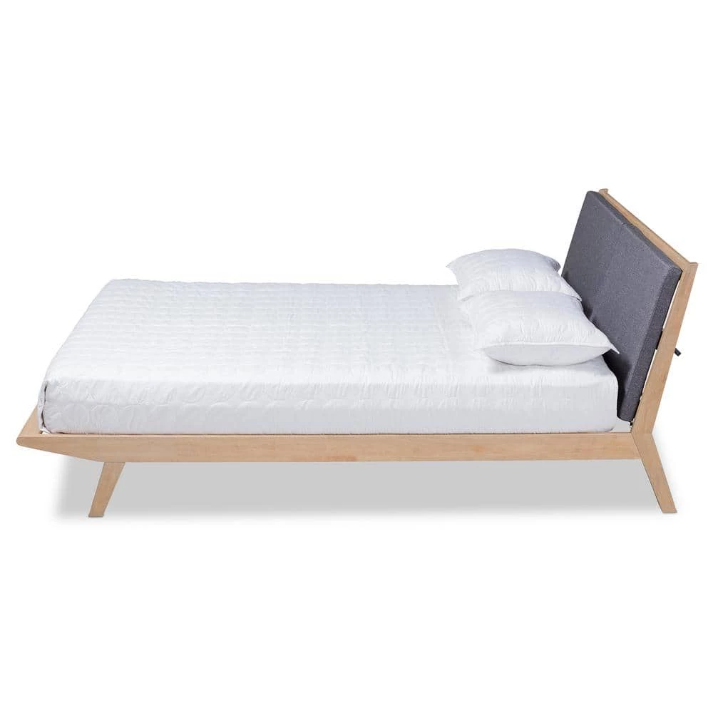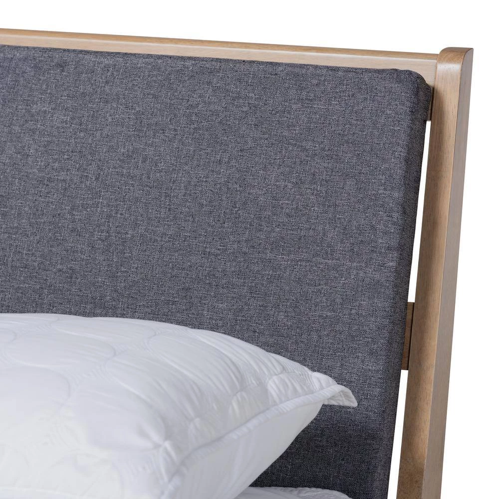 A modern take on classic mid-century style, the Emile bed adds a chic vibe to any bedroom. Built with a low platform, the Emile features an extended footboard and angled legs for an ultra-contemporary look. The headboard is upholstered in a soft, elegant grey fabric that provides ample comfort for you to lean against. Its natural oak finish complements the grey headboard and gives any space a light, open feel. The Emile bed is made in Malaysia and requires assembly.