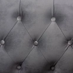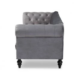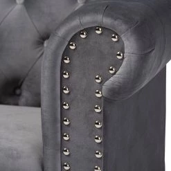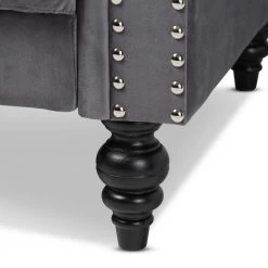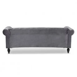 The classic chesterfield sofa receives a modern twist with the Emma sofa. This distinctive piece is upholstered in a soft, sumptuous velvet fabric and padded with plush foam. Elegant button tufting and rolled arms allude to traditional design, while silver metal nailheads lend a modern touch. Exquisite black ring turned feet complete the look of this stylish sofa. The Emma sofa is made in Malaysia and requires assembly.