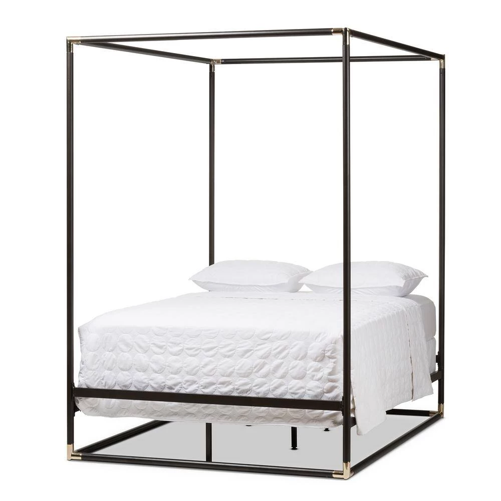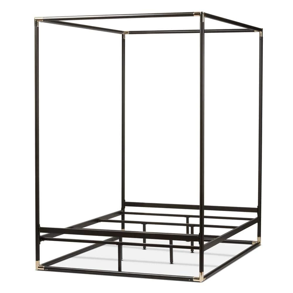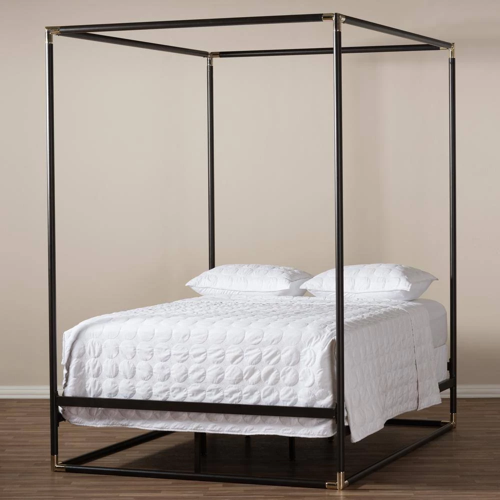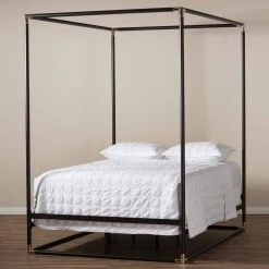 Setting the tone of entire aesthetic of your bedroom with this matte dark bronze finishing canopy queen bed frame. Constructed of tubular metal frame, the Eva is powder-coated and accented with glam brass-tone tips at the corners as a modern and luxury touch. The box frame floats on an airy space, providing substantial storage space for your bedroom clutters under the bed base. Four metal bars and metal legs supporting the bed base sturdily. To complete the bed frame, you will need a US standard size box spring and mattress. Made in Malaysia, the Eva requires assembly.