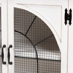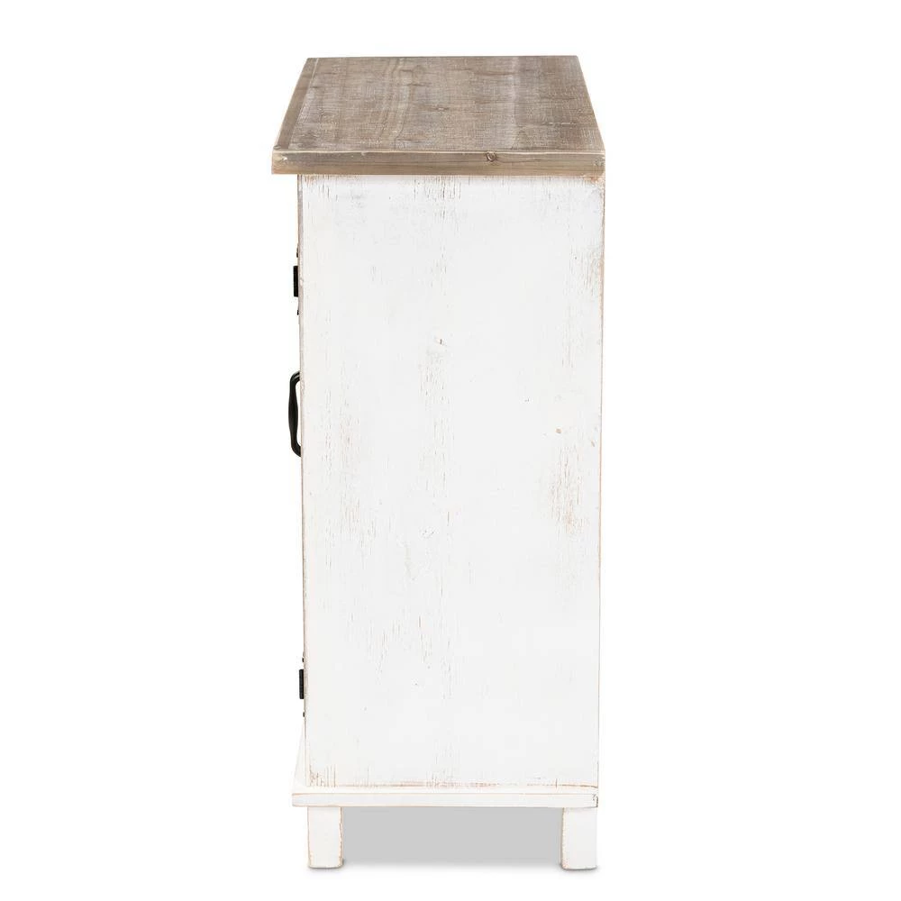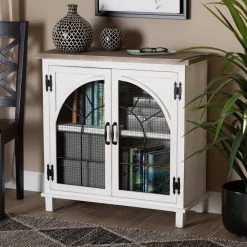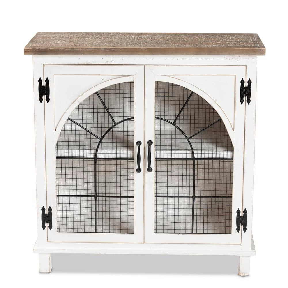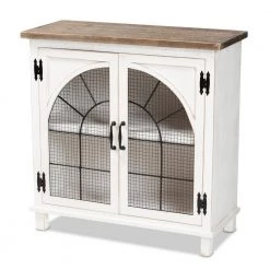 Organization is made easy with the charming Faron cabinet. Made in China, the Faron is comprised of a sturdy wood frame featuring a lightly weathered two-tone white and oak brown finish for an aged, vintage look. 2-shelves behind the doors provide ample storage space to assist in organizing busy areas. Fully assembled, the Faron is adorned with antique inspired, black finished metal accents for a cool, industrial touch. A fantastic assistant to the modern household, the Faron cabinet adds value to any space.