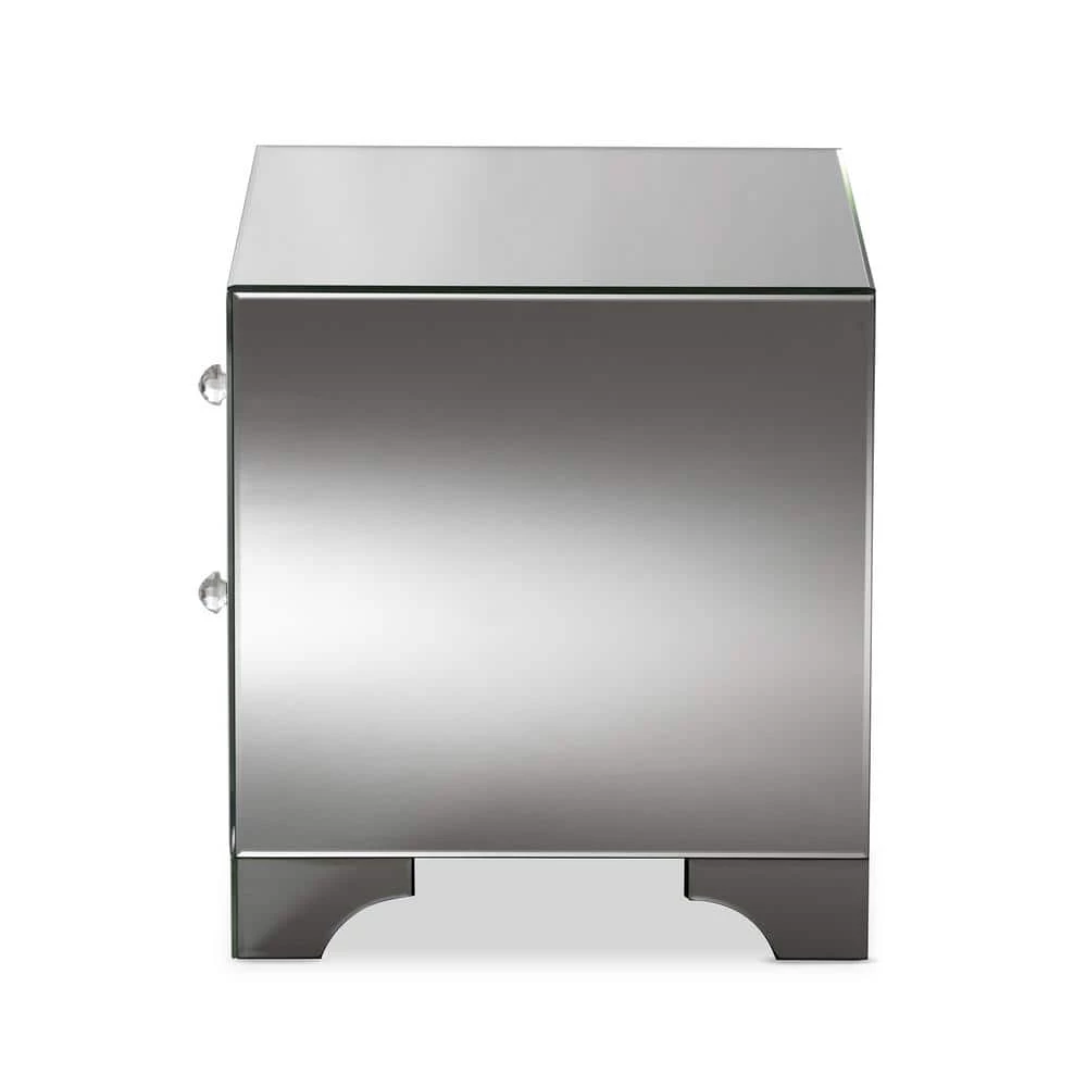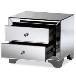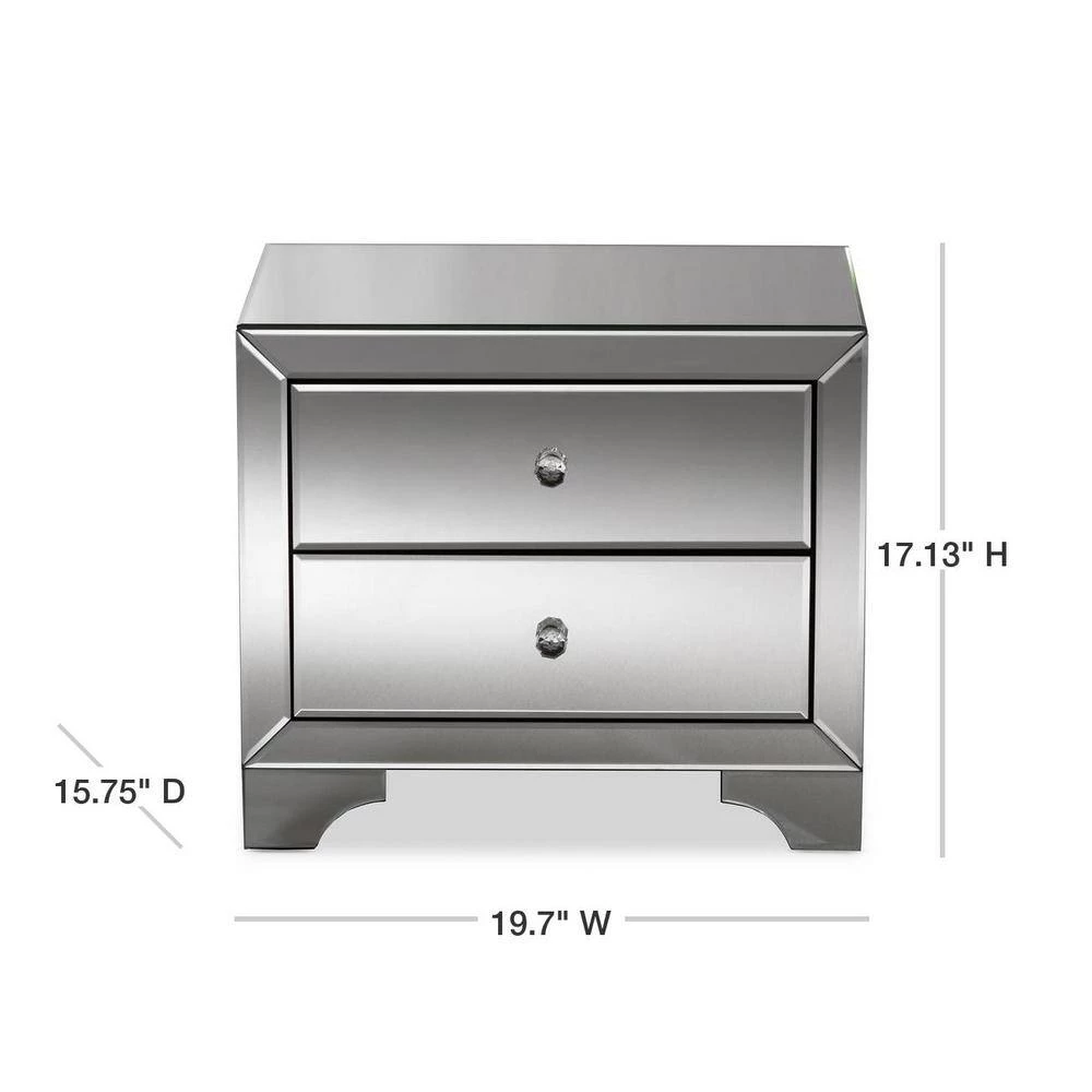 Create an uplifting space with the chic Farrah 2-drawer nightstand. Featuring a stunning piece of furniture, the Farrah will add light, sparkle and luxury to your bedroom as well as space for storing your personal items. Constructed of MDF and encased with mirror, the Farrah is a good size bed side table for your every day’s convenience. Two drawers, with soft close feature provides ample storage in your bedroom. Decorated with clear crystal drawer handles, the Farrah looks glamour from all angles. The attached mirrored feet elevate the height of the nightstand to match with your bed. Made in China, the Farrah will arrive fully-assembled.