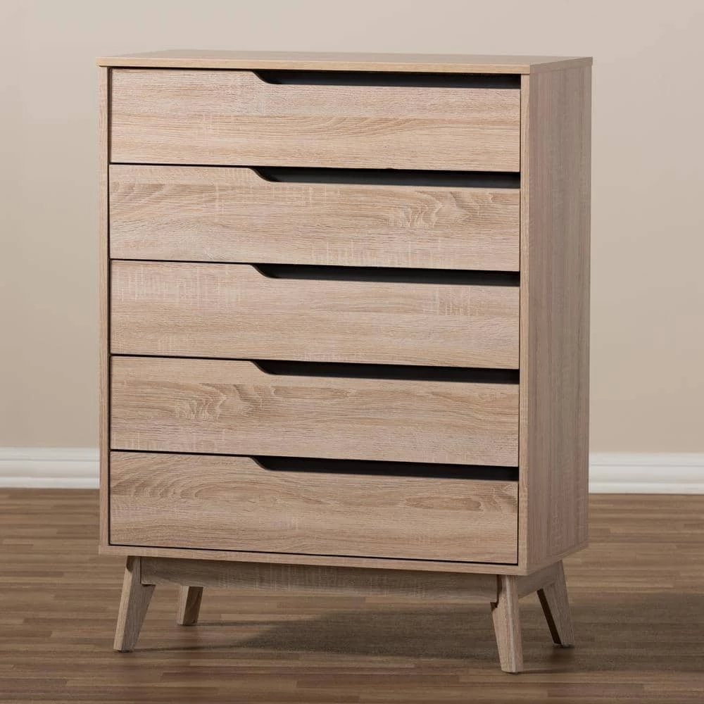 A perfect blend of classic and modernity, the Fella collection showcases pattern played with clever balance of colors and sleek surface. Constructed of engineered wood in oak and grey 2-tone finishing, the Fella 5-drawer chest reveals a fresh and relaxing look. Angled legs complements the piece of furniture for superior support and style. Five drawers open to reveal storage room for linen and clothes. With practicality, the inset handles in grey wood finish contrasts with the oak surface for a contemporary, Scandinavian aesthetic in your home. Made in Malaysia, the Fella 5-drawer chest requires assembly.