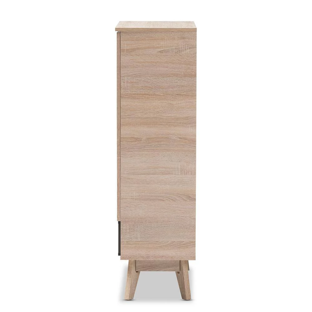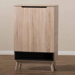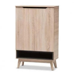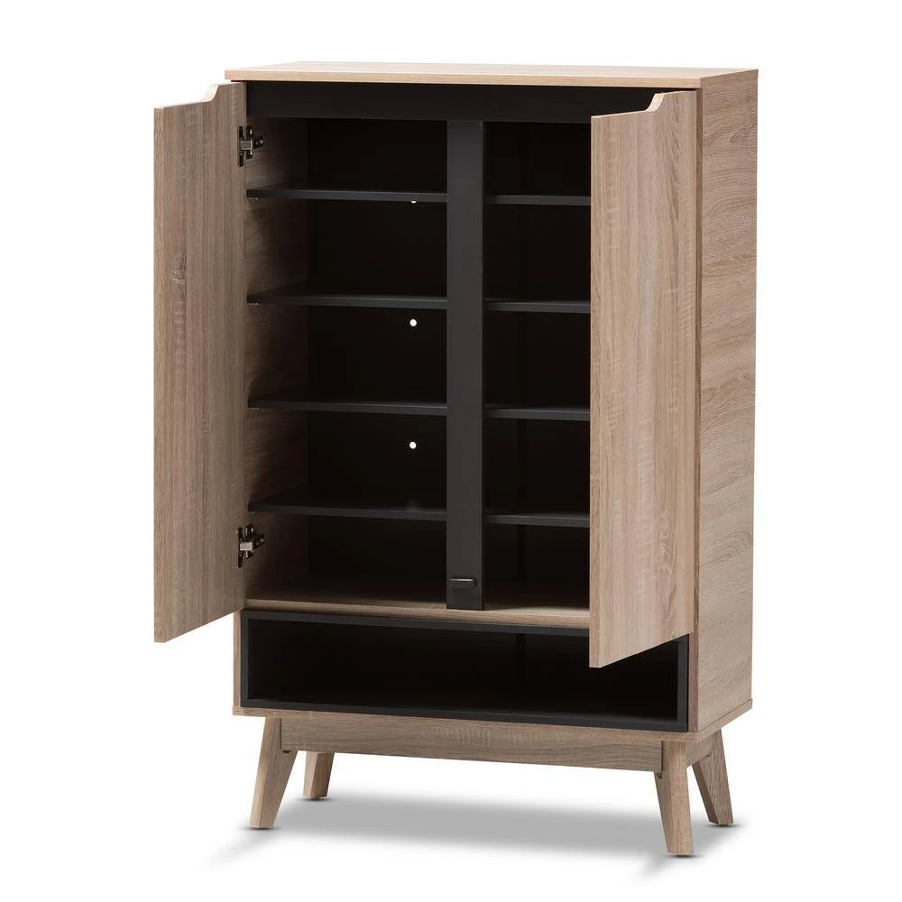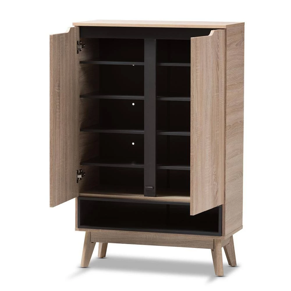 A perfect blend of classic and modernity, the Fella collection showcases pattern played with clever balance of colors and sleek surface. Constructed of engineered wood in oak and grey 2-tone finishing, the Fella 5-drawer chest reveals a fresh and relaxing look. Angled legs complements the piece of furniture for superior support and style. 2-doors open to reveal storage room for shoes. With practicality, the inset handles and the open shelves in grey wood finish contrasts with the oak surface for a contemporary, Scandinavian aesthetic in your home. Made in Malaysia, the Fella 2-door shoes storage cabinet requires assembly.