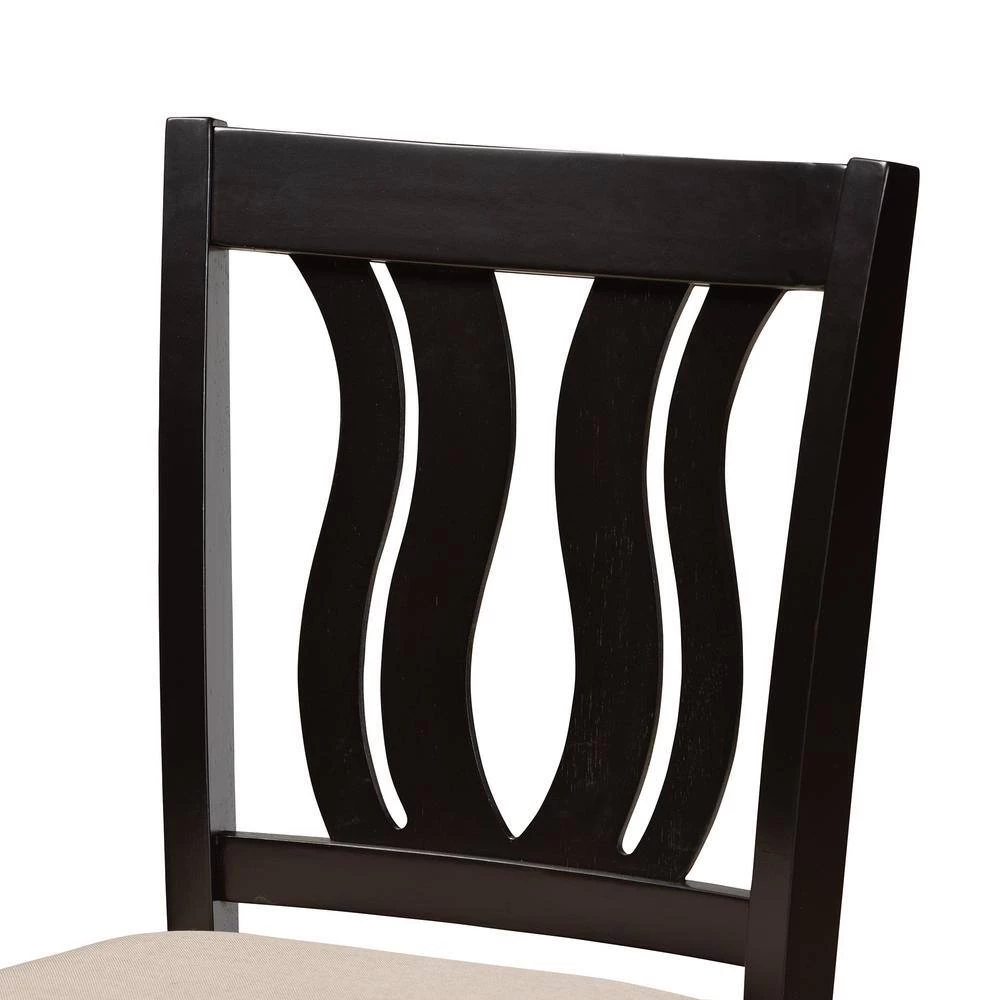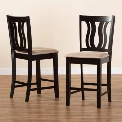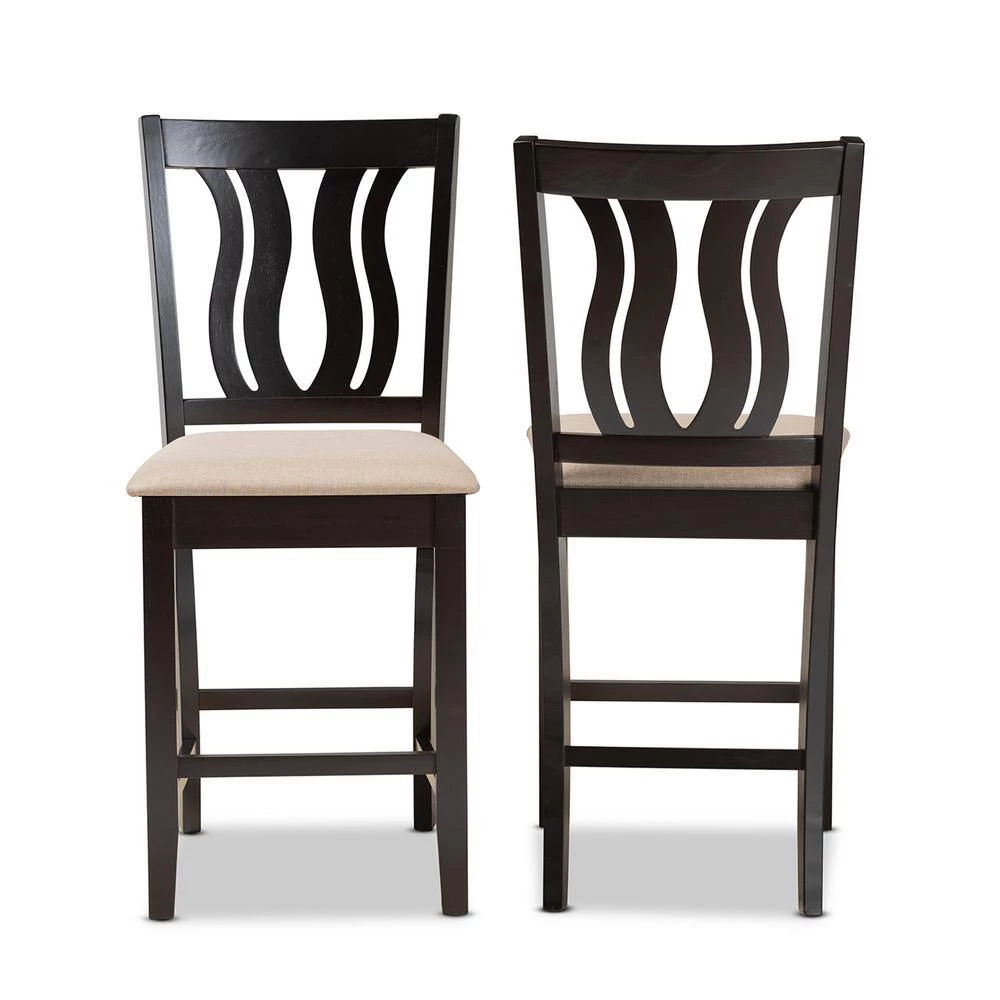 Featuring a unique, symmetrical design, the Fenton counter stool adds elegance to any dining space. Made in Malaysia, this stool is comprised of a sturdy wood frame showcasing a rich dark brown finish. The Fenton is padded with soft foam and upholstered in smooth fabric for superb comfort. Requiring assembly, the backrest showcases a striking geometric design for added visual appeal. An ideal combination of comfort and contemporary style, the Fenton counter stool elevates any dining experience.
