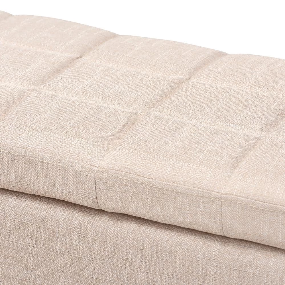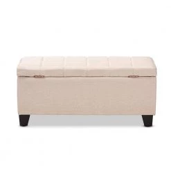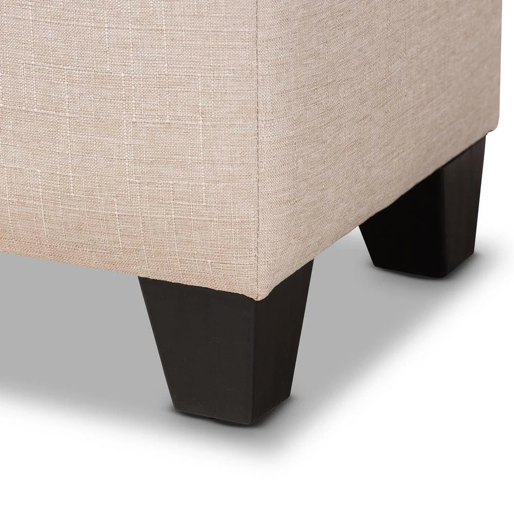 Stylish and versatile, the Fera storage ottoman is a useful addition to any room in the home. This modern ottoman displays a simple, streamlined design that makes it complimentary to a wide range of decor styles. Upholstered in a soft, neutral polyester fabric, the lid is foam-padded and biscuit tufted to provide the utmost sitting comfort. The ottoman features a storage compartment under the lid, providing space to store extra blankets and pillows. Black-finished wood feet complete the look. Use this piece as both seating and storage in the entryway, living room, or bedroom. The Fera storage ottoman is made in China and requires assembly.