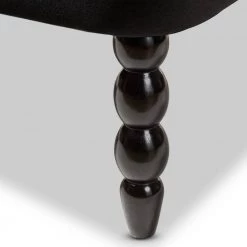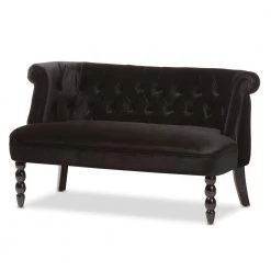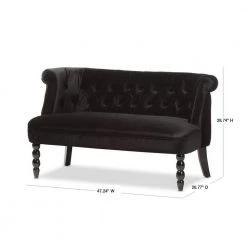 Be embraced by the comfortable cushioning of the Flax Black Fabric Loveseat. With its tufted cushioned back, this loveseat gives your body all the support you need to sit and relax for hours. The combination of ball-turned wood legs and gently rolled back seat give unique look and make it stand out. The black velvet upholstery adds another element of elegance making it a perfect statement piece for any living space.