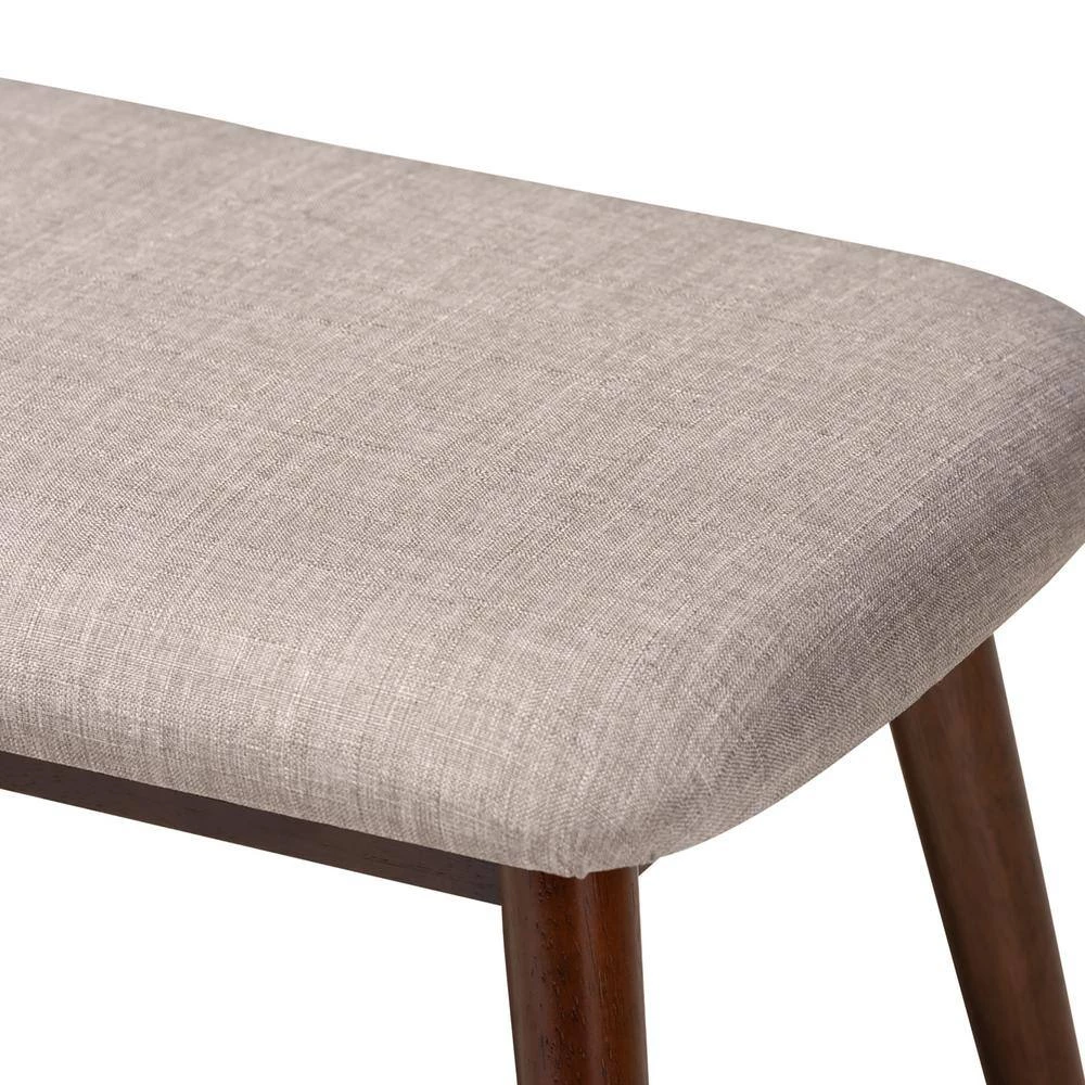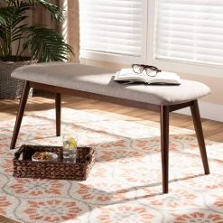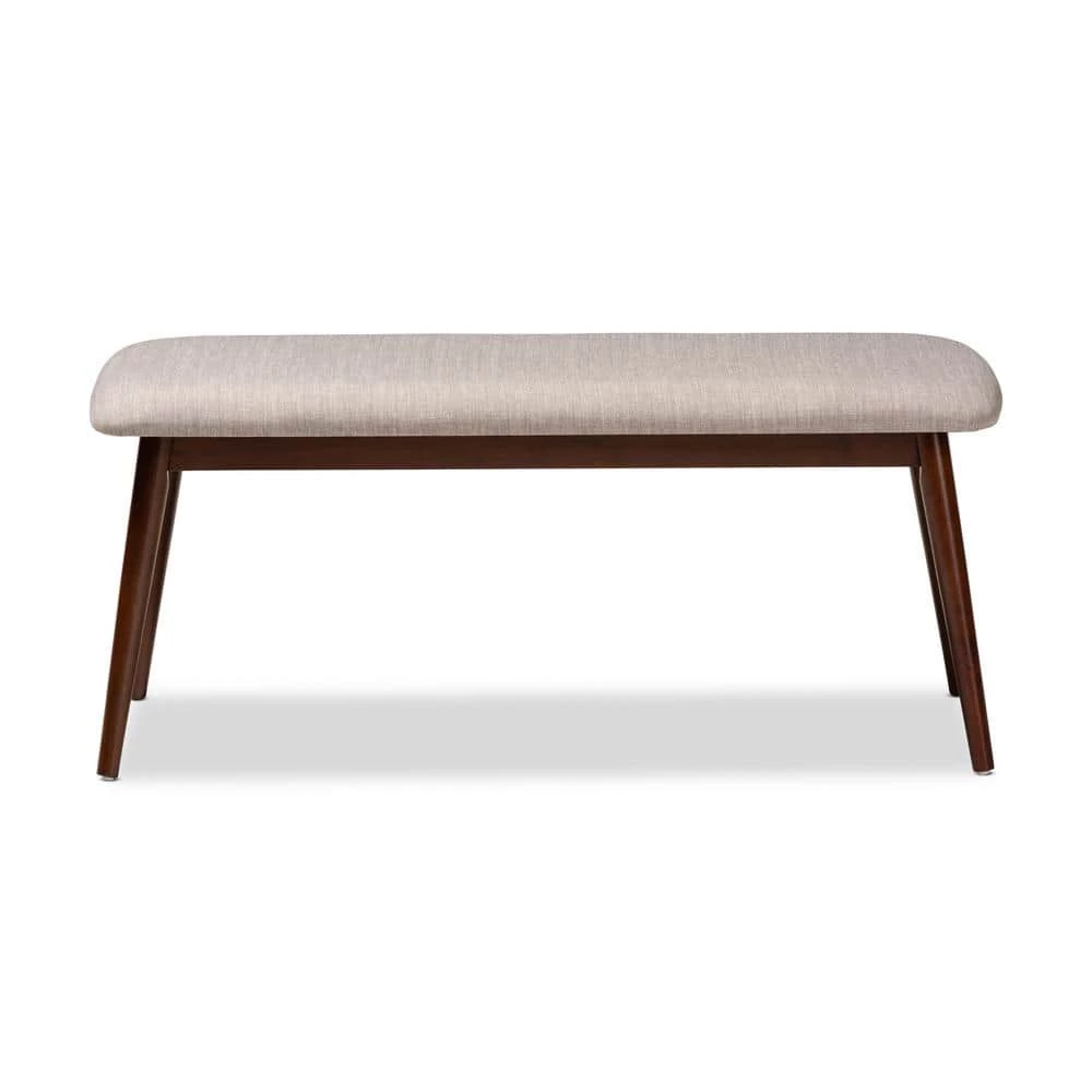 Featuring a stunning walnut brown finish, the Flora dining bench brings warmth to any dining space. Constructed from solid rubberwood, the Flora is upholstered in a soft, durable polyester fabric and padded with foam. Expert craftsmanship is displayed in the curved edges and the smooth grained finish. Designed for everyday use, the seat is supported by four angled, tapered legs that create a modern profile while also providing ample legroom. The Flora dining bench is made in Malaysia and requires assembly.