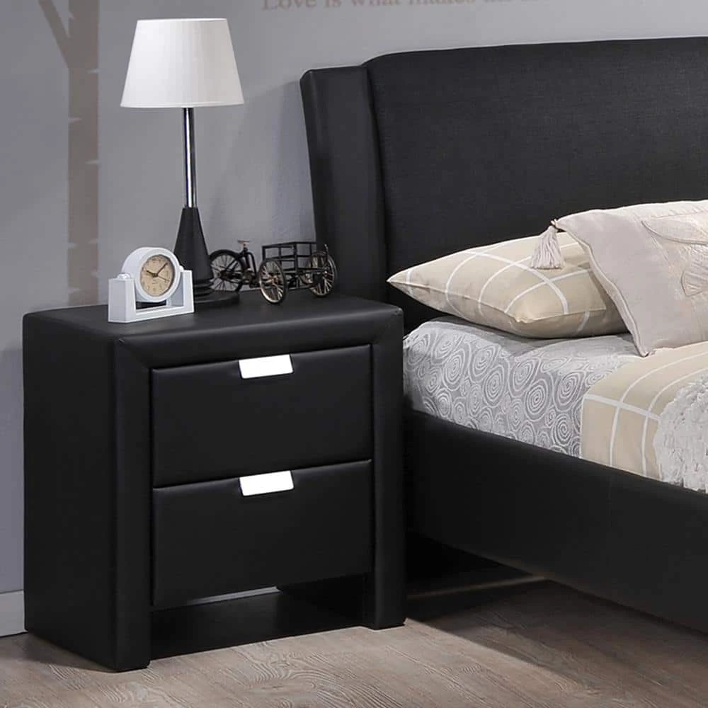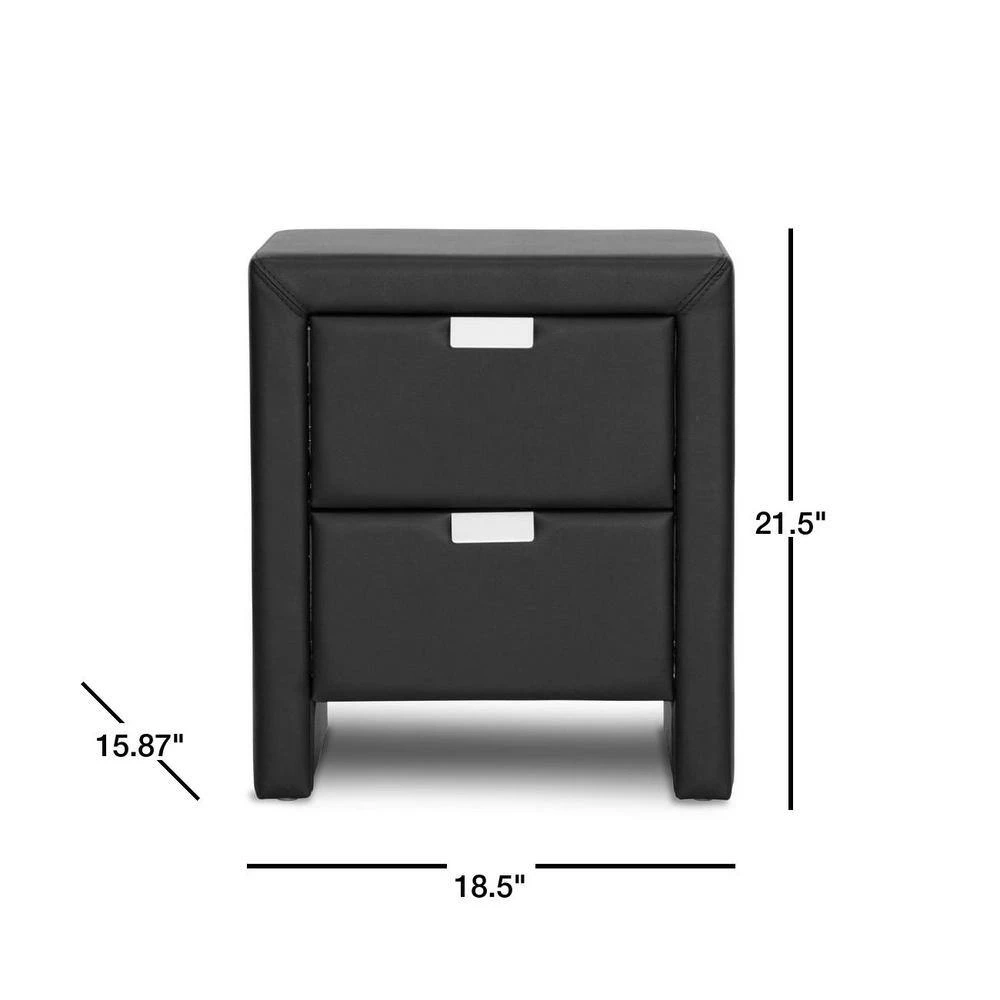 The Frey Designer Nightstand makes it easy to stash your odds and ends, turning clutter into sleek contemporary goodness. The Frey Nightstand is made in Malaysia with a sturdy plywood and hardwood frame topped with a thin layer of foam padding and black faux leather. Silver drawer pulls not only allow the 2-drawers to be opened with ease but add another layer of modern polish. The modern bedside table, which comes fully assembled, is also available in white (sold separately). To clean, wipe with a damp cloth. Product dimension: 18.5 in. W x 15.87 in. D x 21.5 in. H, drawer(2): 12.37 in. W x 12.62 in. D x 5.5 in. H.