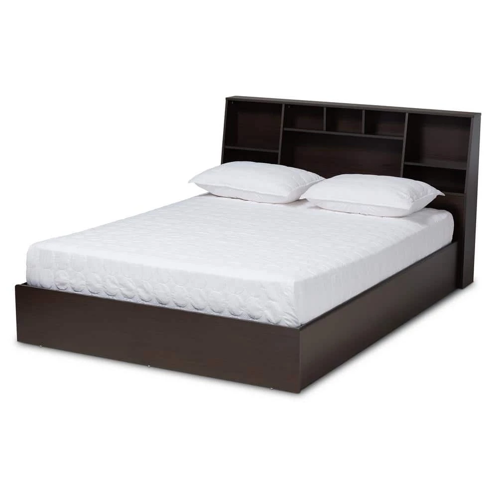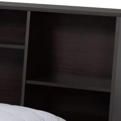 Striking and ergonomic design bring a unique style to the bedroom with the Geoffrey platform bed. Its sleek, angled headboard is fitted with compartments of various sizes to provide display space for books, decorations, and more. Made in Malaysia, the Geoffrey is constructed from wood finished in a soothing dark brown to add a relaxed vibe to any bedroom. Assembly is required and a box spring isn’t necessary, as the Geoffrey comes with a paneled platform base for mattress support. Transform your bedroom into a fashionable space with the versatility of the Geoffrey bed.