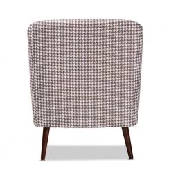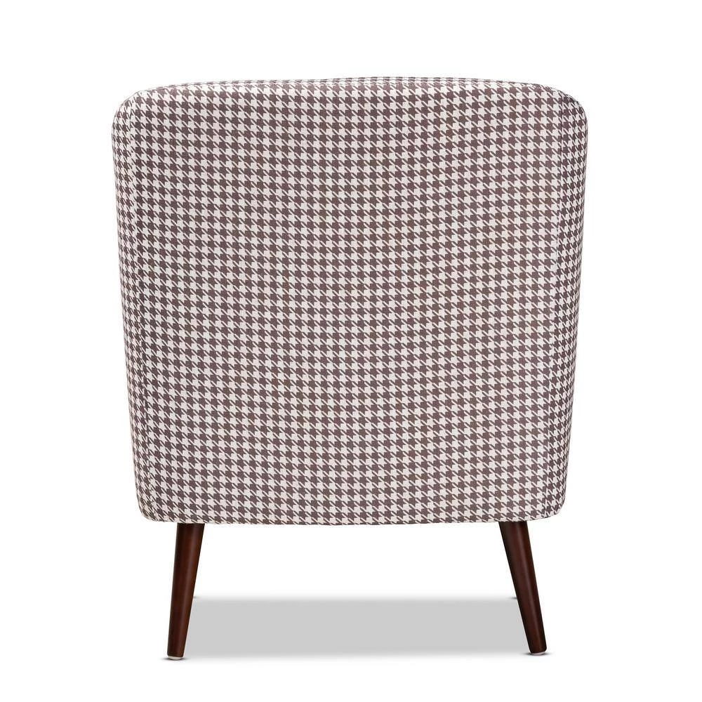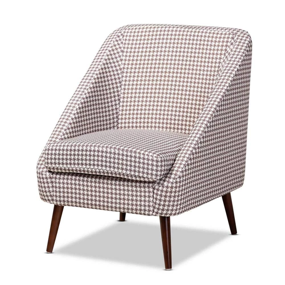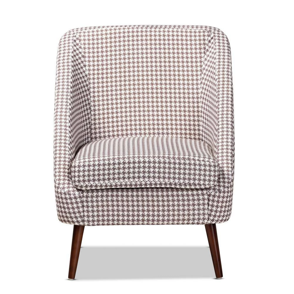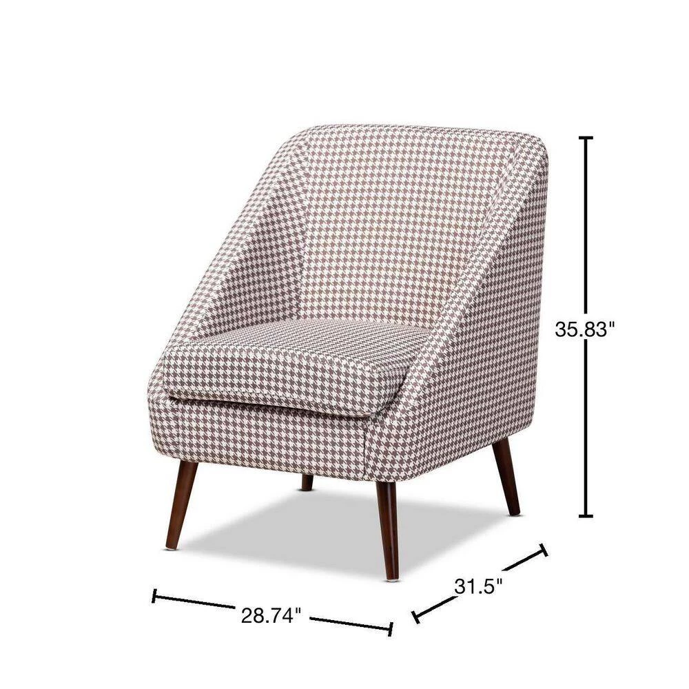 Liven up your living space with the bold sophistication of the Gia accent chair. Featuring long sloping arms and rounded edges, the Gia chair conveys a chic, modern look. Classic brown and white houndstooth fabric upholstery complements the modern silhouette and gives the chair a cool retro vibe. Sturdy walnut brown splayed legs provide solid support. The Gia accent chair is made in China and requires assembly.