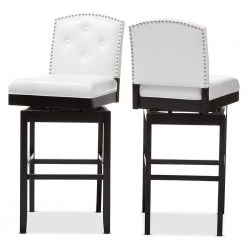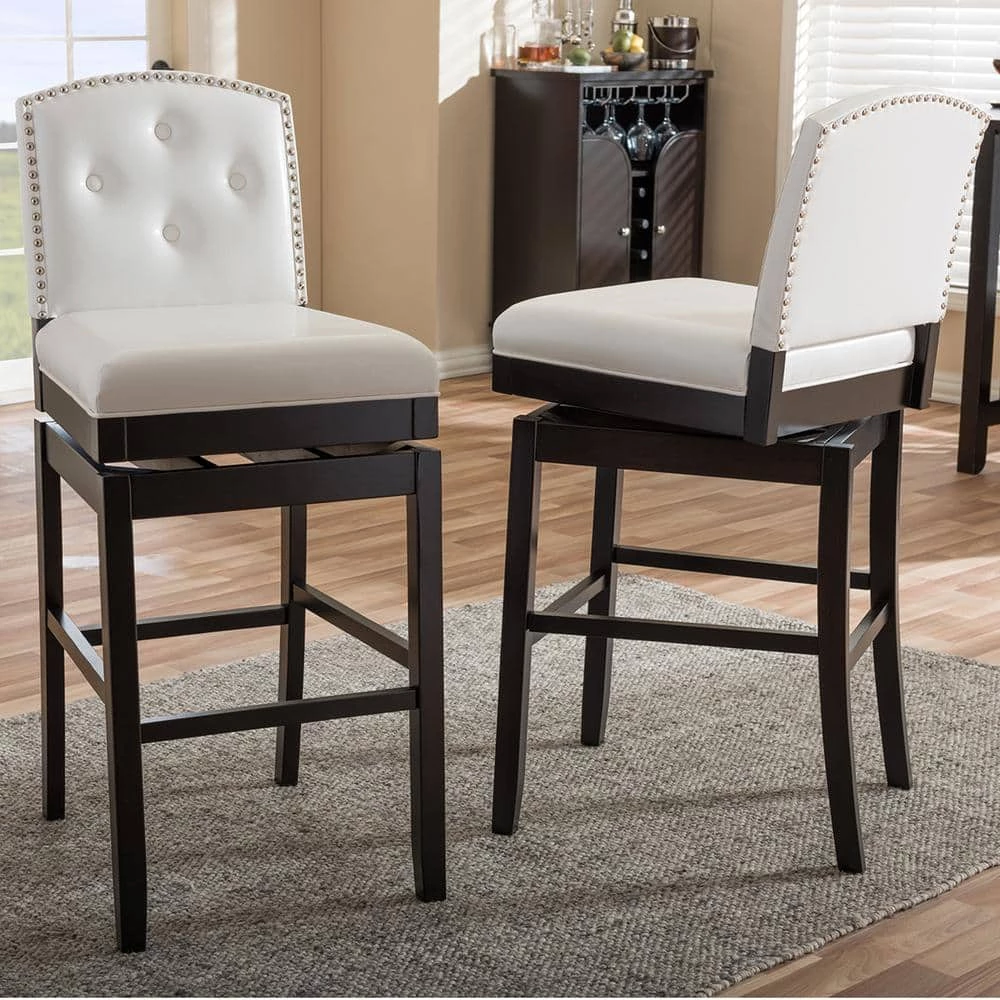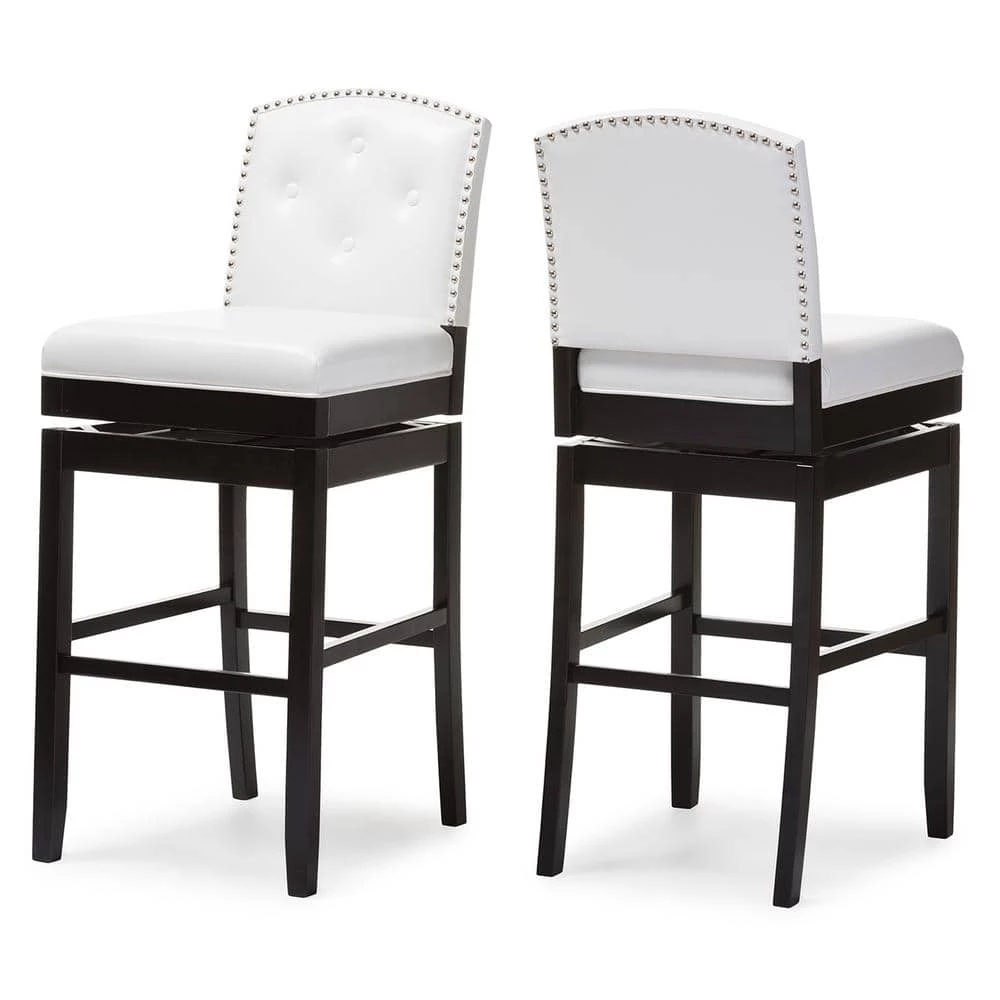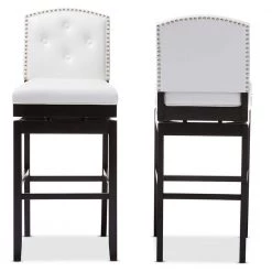 Select the Baxton Studio Ginaro Bar Stool to spruce up any seating area. This stool has a full back for the comfortable feel of a chair combined with the look of a stool. It features an armless design, so you can tuck it under the table or bar. Featuring a modern style, it is great for contemporary kitchen designs. Designed with a wooden frame, it is easy to maintain and creates a homey, visually pleasing look. It features a faux leather seat, adding a stylish touch. This white stool perfectly contrasts with darker interiors for a monochromatic room decor. This stool is embellished with tufted detailing, giving it a tailored appearance that will look beautiful in any room.