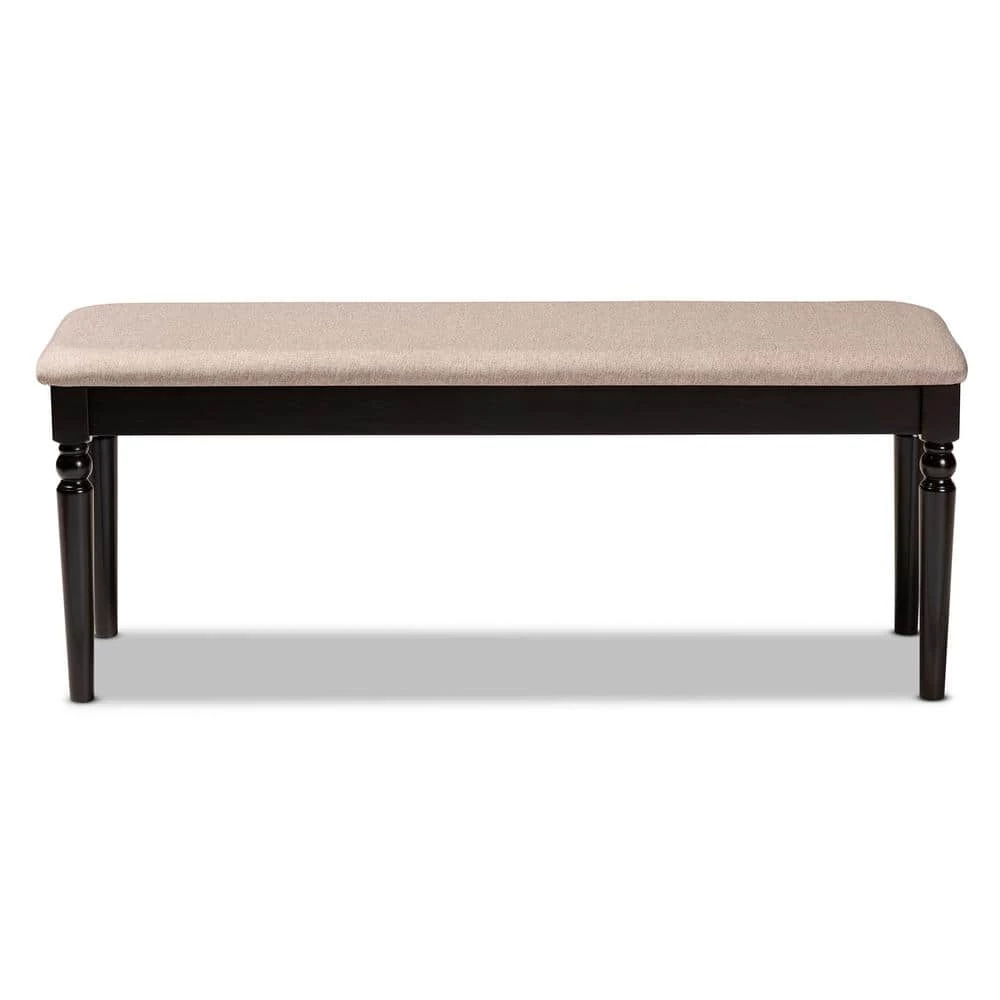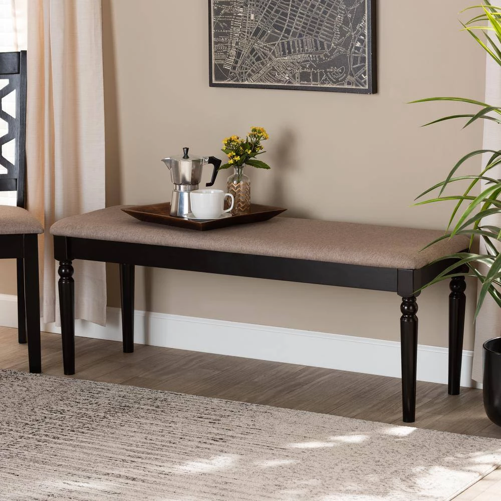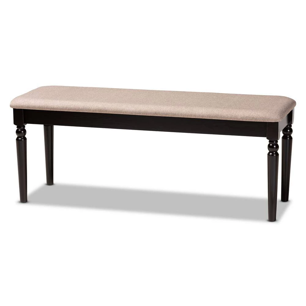 Enhance your dining space with the graceful comfort of the Giovanni dining bench. Made in Malaysia, the Giovanni is comprised of sturdy wood finished in a rich dark brown. Equipped with a large foam-padded cushion upholstered in soft fabric, the Giovanni provides exceptional seating comfort. Requiring assembly, the bench features ball turned legs for a classic look. The elegant and versatile Giovanni dining bench works well with a dining set or as an accent piece in the entryway.