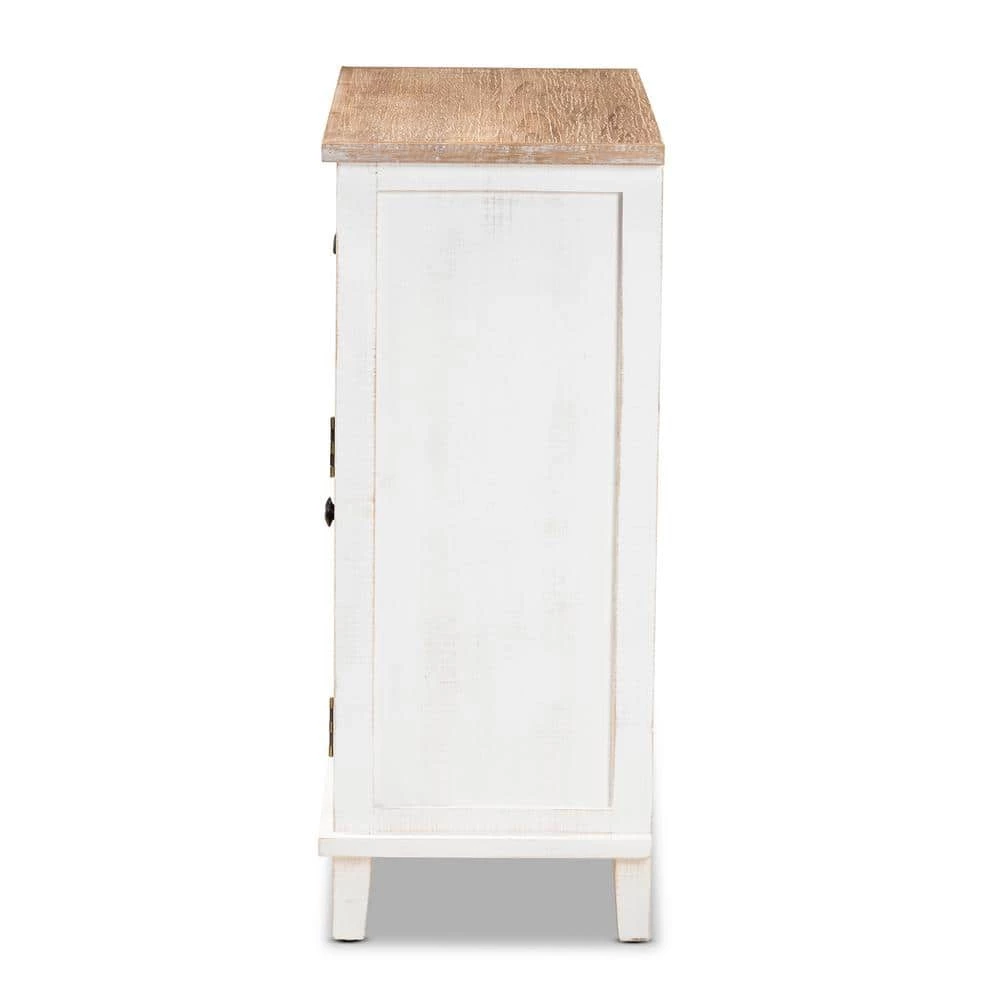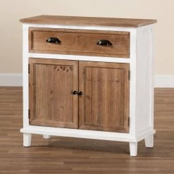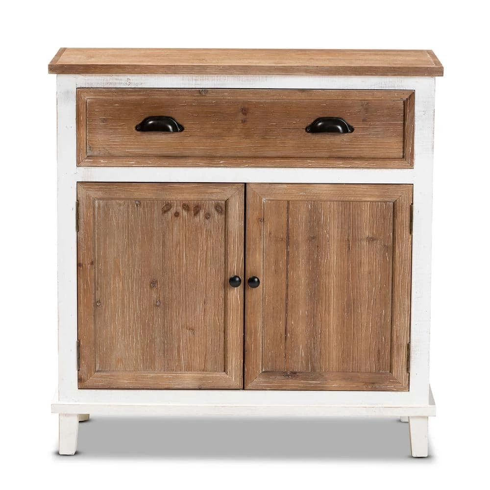 A natural color palette and convenient utility make the Glynn cabinet a fantastic addition to any kitchen or dining room. Made in China, the Glynn is comprised of a wood frame showcasing a lightly weathered two-tone white and oak brown finish for an aged look. One drawer and a compartment behind two doors provide ample storage space to help organize busy areas. Fully assembled, the Glynn is accented with black finished metal handles for a touch of modern charm. A handy piece that easily blends in with modern room layouts, the Glynn cabinet easily upgrades any space.