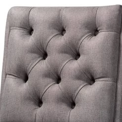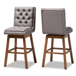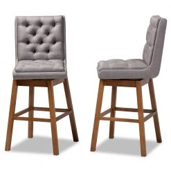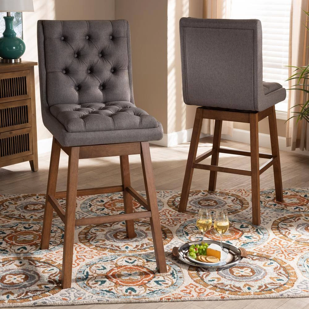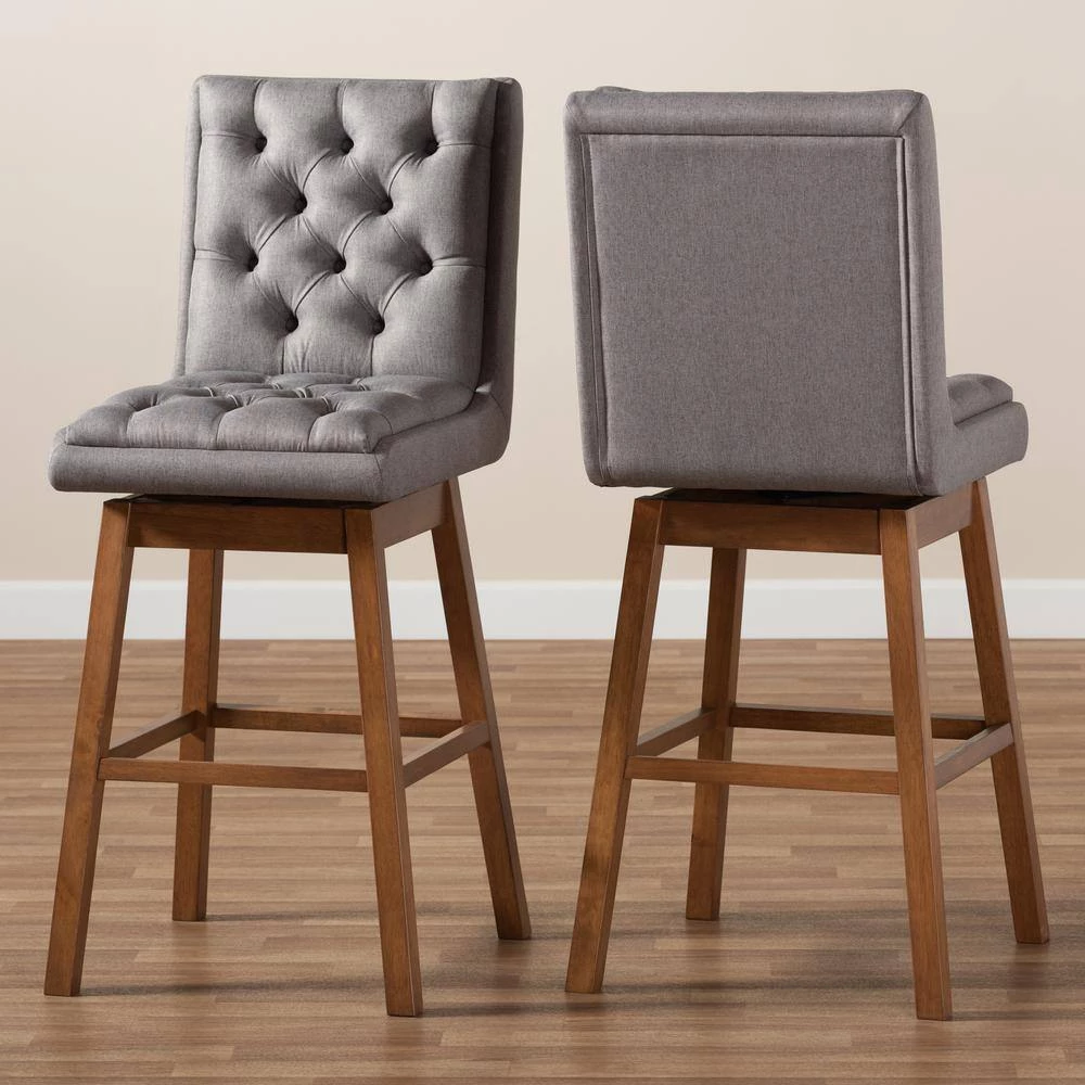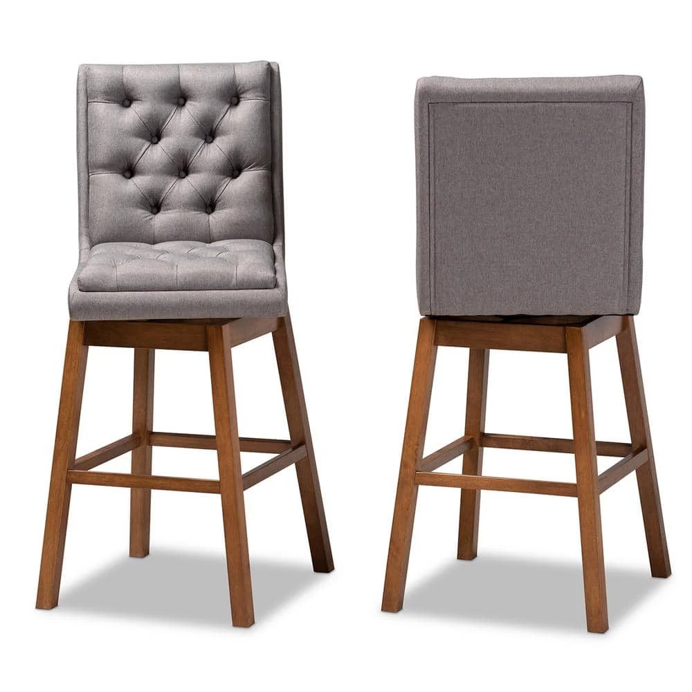 Kick back and relax with the Gregory bar stool. The Gregory is padded with foam cushions underneath grey polyester fabric and enhanced with elegant button tufting, making this piece a perfect addition to relaxed settings like a home bar or dining room. Made in Malaysia, the stool is supported by an elongated walnut brown finished wood base fitted with foot rests. This 2-piece set requires assembly and utilizes a swivel seat to enable movement. The Gregory bar stool provides comfortable back support in a fantastic modern design that elevates the home bar to new heights.