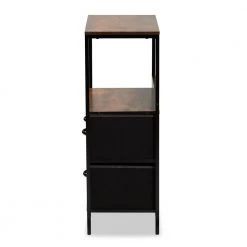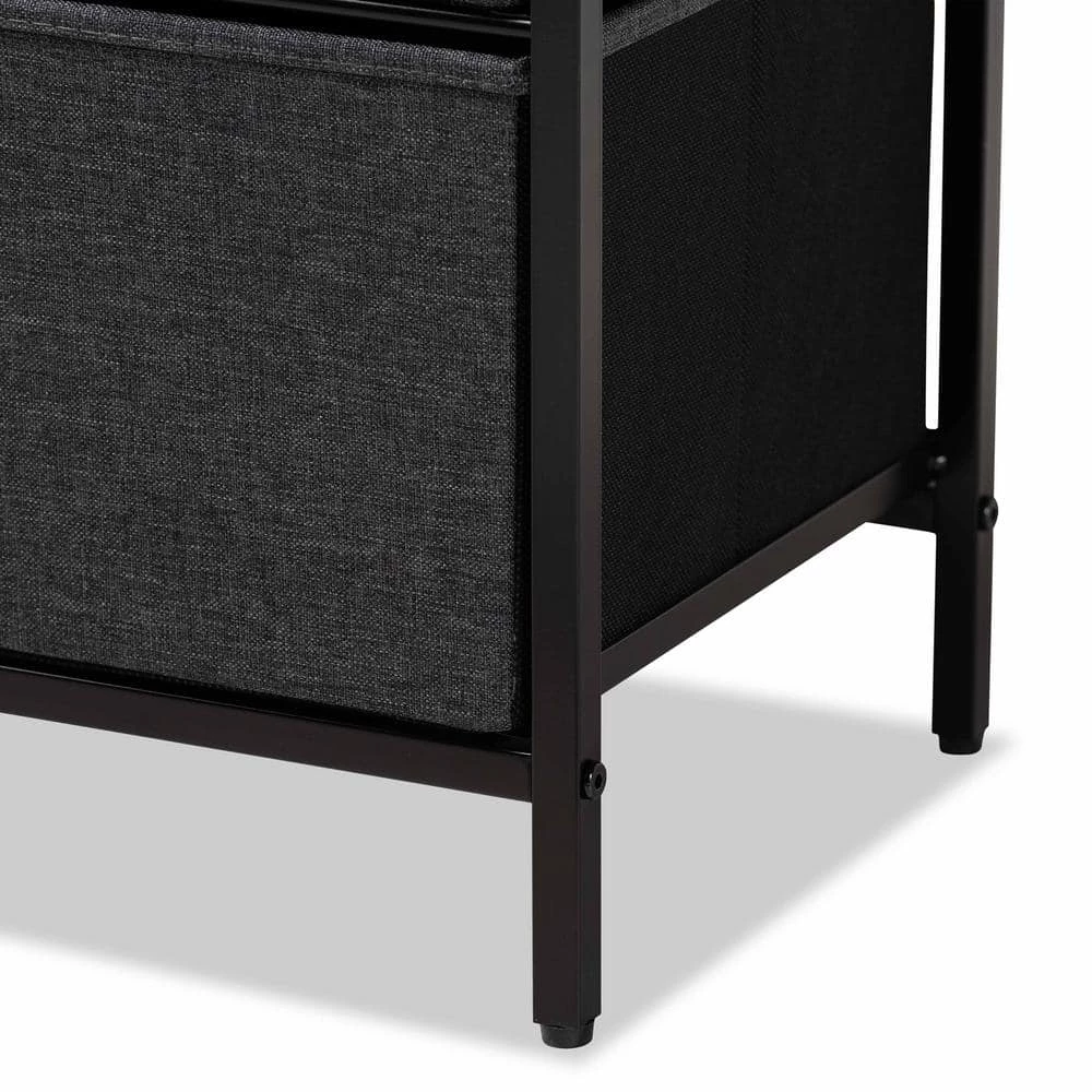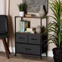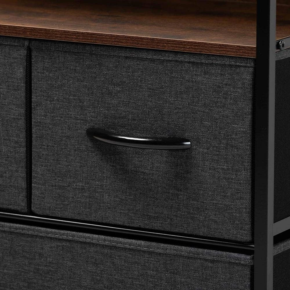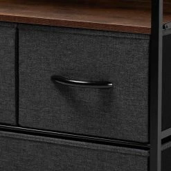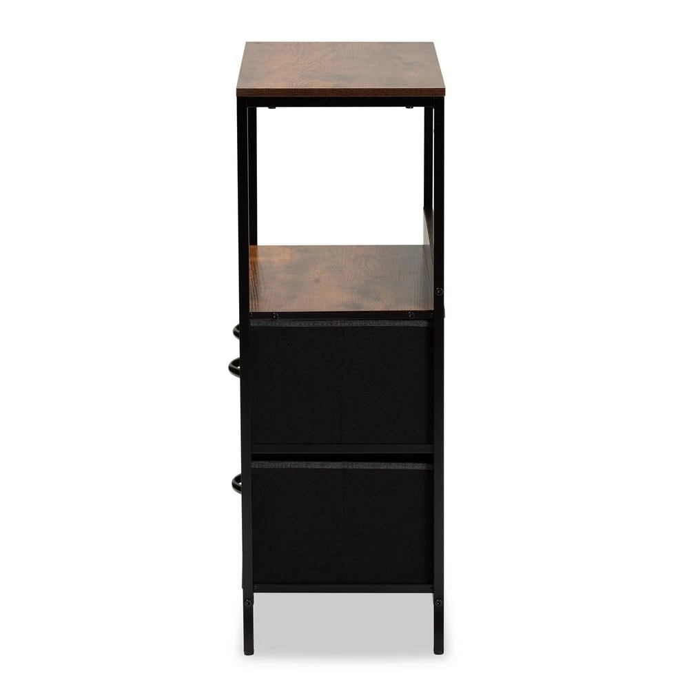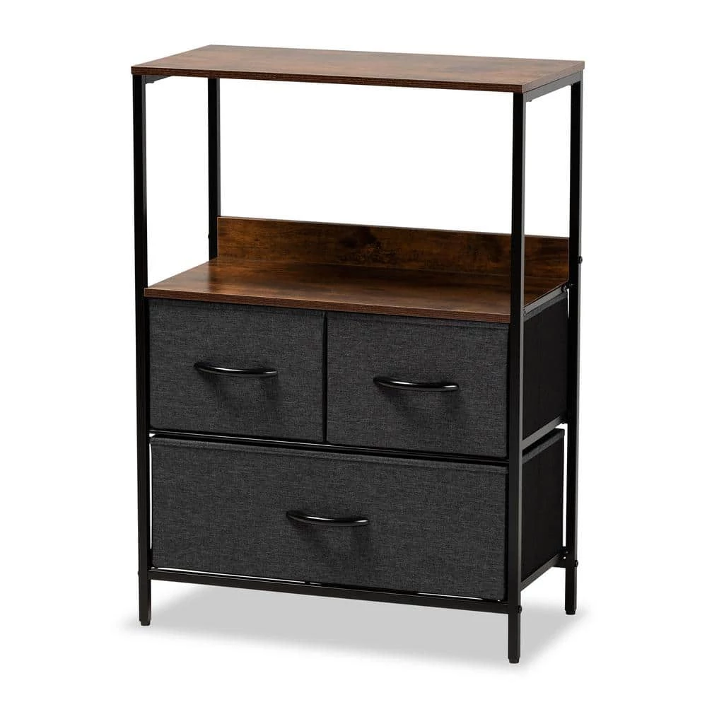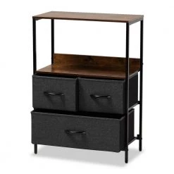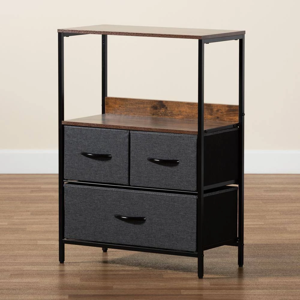 Blending modern and industrial design elements, the Hakan cabinet is an exceptional solution to your storage needs. Made in China, this cabinet is comprised of a solid metal frame fitted with wood shelves and fabric upholstered drawers. The open shelves and wide tabletop offer space to organize and display decorations, while three drawers provide secure storage space. Requiring assembly, the Hakan features curved drawer handles that complement the minimalist metal frame. A fantastic accessory and tool, the Hakan storage cabinet adds the finishing touch to any space.