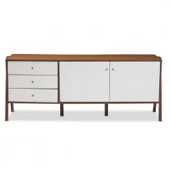 Highlight the handsomely modern feel of your space with the superior storage and Scandinavian style of the Harlow Sideboard Cabinet. Made from sustainably sourced engineered wood and sturdy rubber wood legs with lasting quality, the sideboard is finished in white and walnut two tone PU veneer. The two doors open to reveal internal shelving that’s ideal for storage with three additional drawers on the left. Angled legs complement the white-and-walnut contrast tones for a design steeped in retro, Scandinavian style. Streamlined style-lines for a contemporary design that works well with a range of interiors, from mid-century to modern and from Scandinavian to Hamptons or urban loft, the Harlow will provide ample storage and style to your entryway or living room for practicality. Made in Malaysia, the Harlow requires assembly.