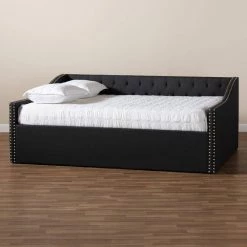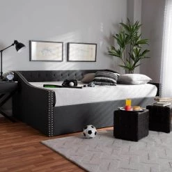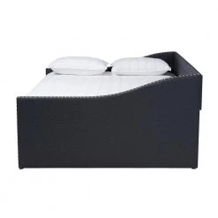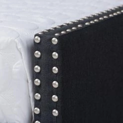Embrace midday naps and restful nights of sleep with the Haylie daybed. This wood daybed is upholstered in a soft, resilient polyester fabric and is padded with foam for the utmost comfort. Button tufting lends a classic look, while silver nailheads highlight the elegant curves on the side panels. Add some throw pillows to create a cozy hangout during the day, then, at night, switch out the pillows for a plush duvet to sleep the night away. The Haylie daybed is made in Malaysia and requires assembly.