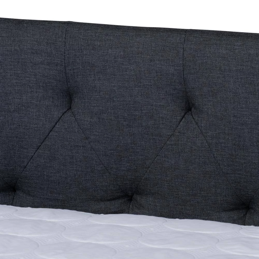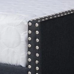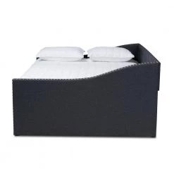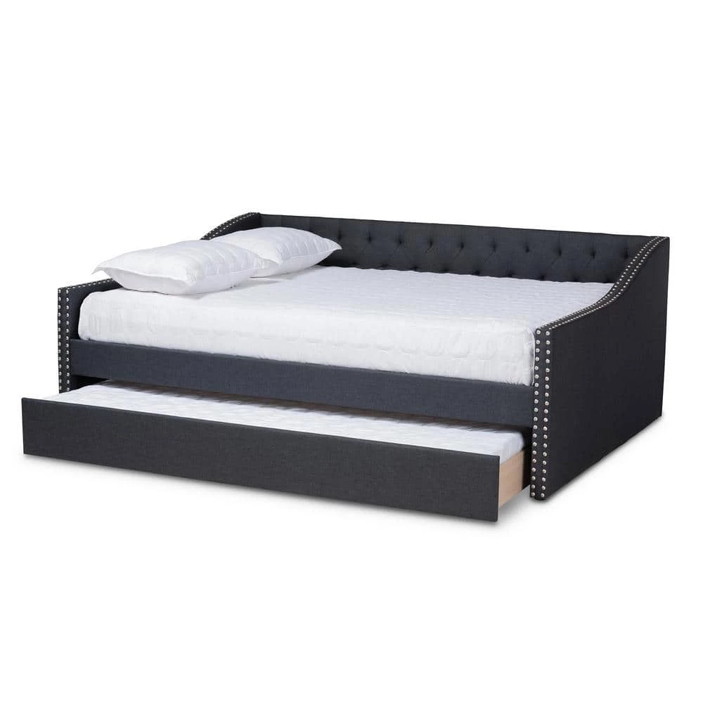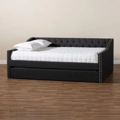 Embrace midday naps and restful nights of sleep with the Haylie daybed. This wood daybed is upholstered in a soft, resilient polyester fabric and is padded with foam for the utmost comfort. Button tufting lends a classic look, while silver nailheads highlight the elegant curves on the side panels. Designed for both style and function, the Haylie is fitted with a roll-out twin size trundle bed to provide convenient accommodation for overnight guests. The Haylie daybed is made in Malaysia and requires assembly.