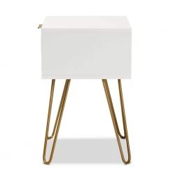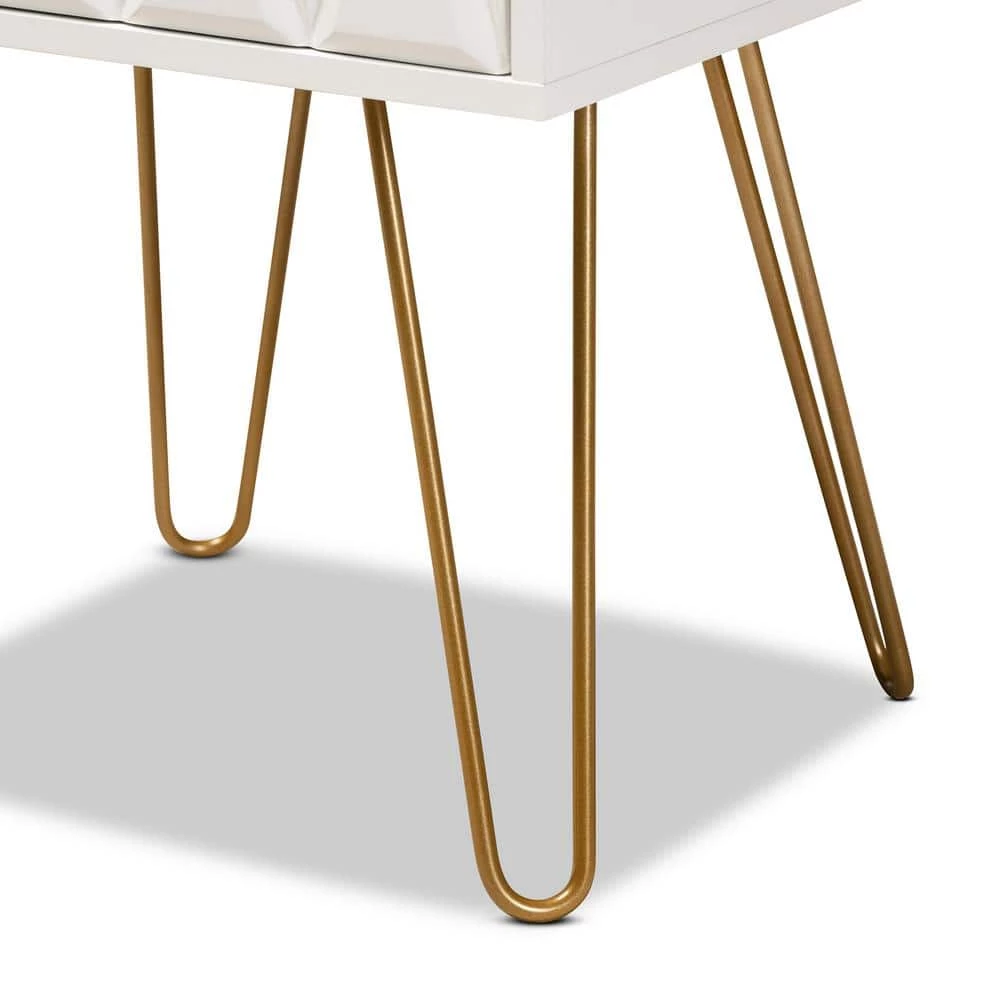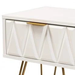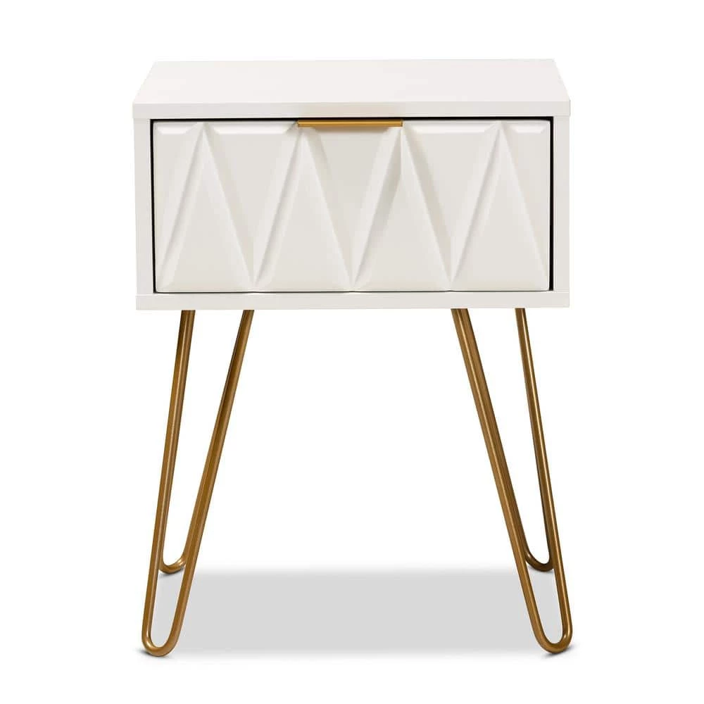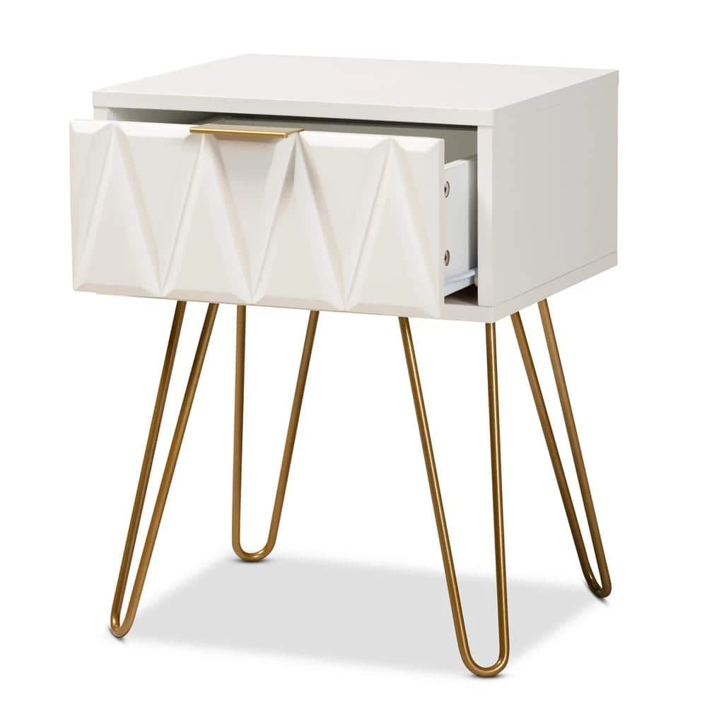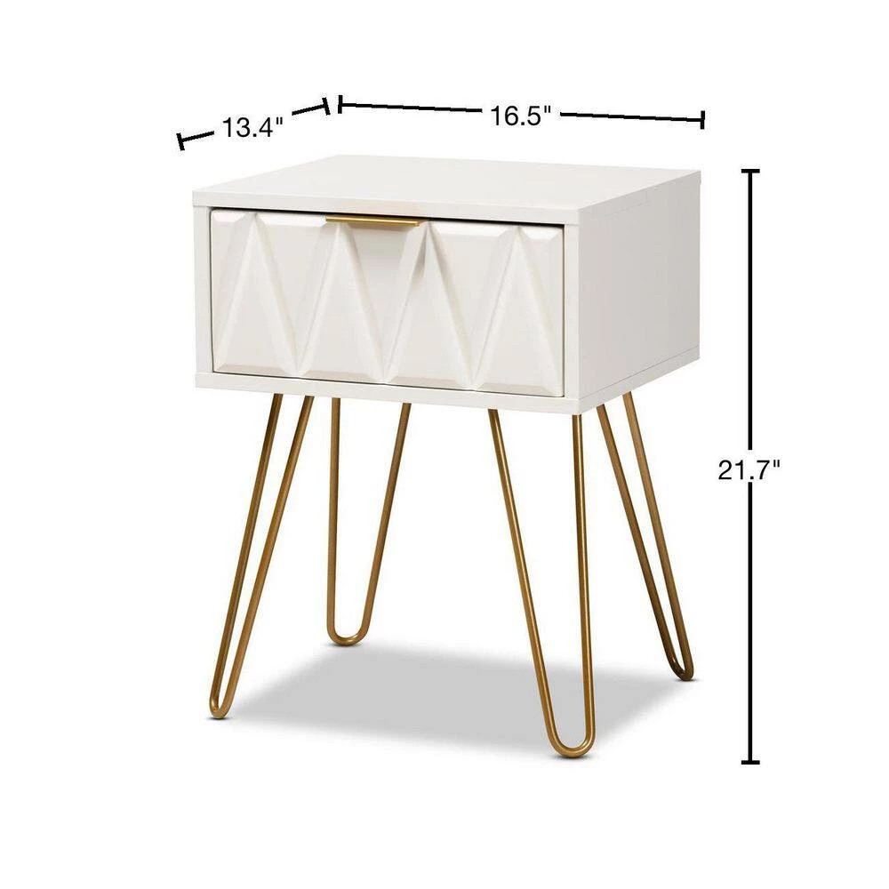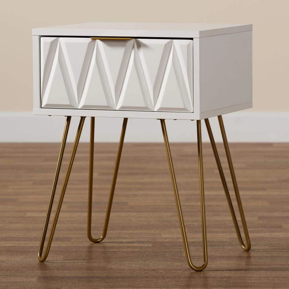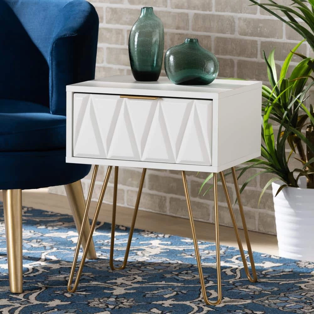 Add a hint of glamour to your space with the captivating design of the Holbrook end table. Made in China, this table is constructed from sturdy wood with metal embellishments. 1-drawer provides convenient storage space, while the sleek, geometric drawer face creates an eye-catching display. Requiring assembly, the Holbrook utilizes hairpin legs for excellent stability and support with a touch of retro charm. A handy piece that radiates charisma, the Holbrook end table is a remarkable addition to any space.