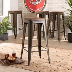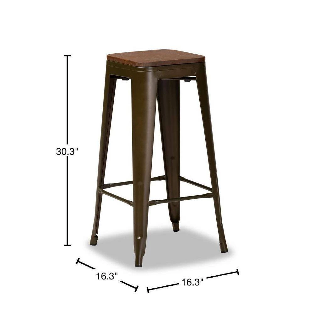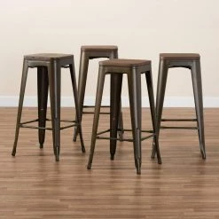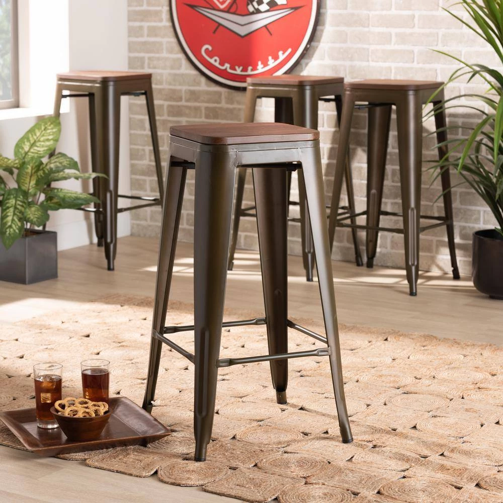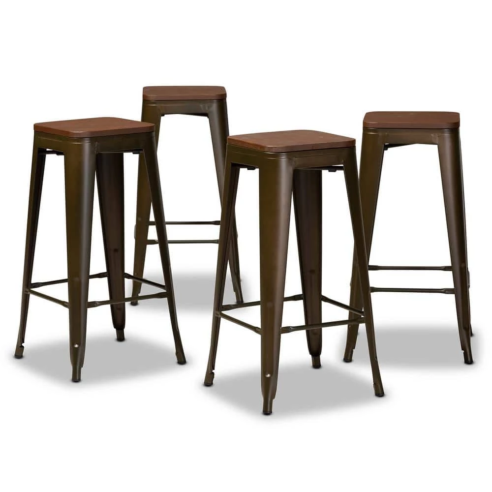 Design a cool, modern lounge in your space with the streamlined style of the Horton bar stool set. Made in China, this set includes four bar stools comprised of brown finished metal. Its minimalist frame is fitted with a flat, walnut brown finished wood seat for excellent comfort and support. The Horton will arrive fully assembled and features a convenient footrest on each side for added comfort. Adaptable to any occasion, the Horton bar stool brings the flexibility of modern design to any space.